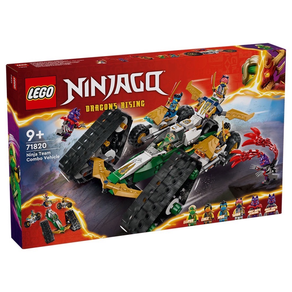 9 歲以上男孩與女孩可暢玩這款忍者團隊合體車(71820)4 合 1 冒險玩具,享受電視影集《旋風忍者® 猛龍崛起》第 2 季的精采冒險。孩子可遊玩大型旋風忍者可動車輛玩具,然後將模型拆成 4 台小型交通工具:索拉搭載 2 支鉚釘射擊器的滑翔機、勞埃德的越野賽車,以及阿剛與赤蘭的摩托車。