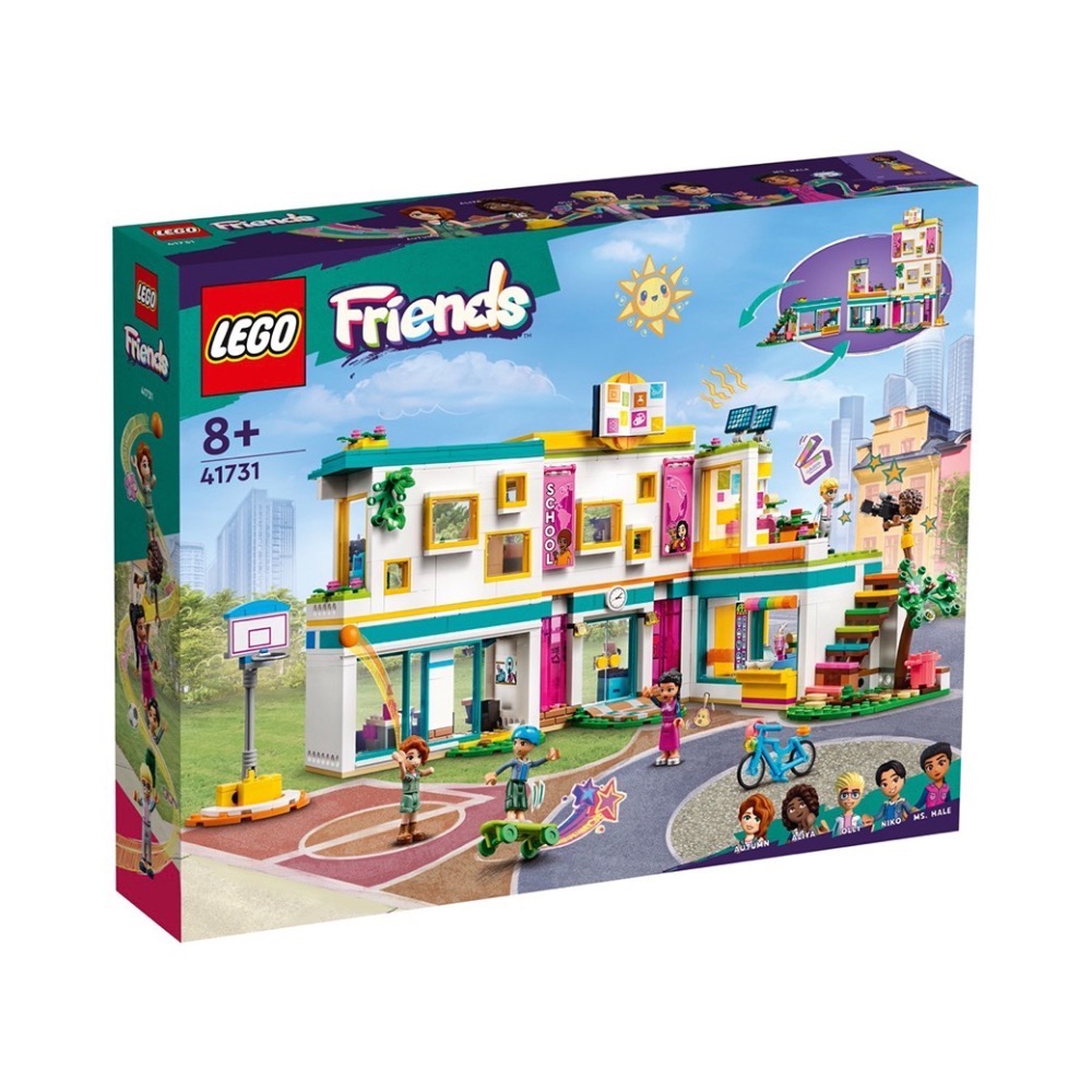 8 歲以上孩子可在 LEGO® Friends 心湖城國際學校(41731)盒組中探索許多新的新課程與文化。他們可查看充滿課程主題配件的教室。模組化設計讓孩子根據他們自己的興趣重新配置學校。裡面有學生餐廳、科學教室、有置物櫃的入口、美術教室、媒體室和浴室。外面有籃框,以及配有安全帽的滑板與腳踏車。無論他們是在照顧班上的倉鼠本生、在美術教室發揮創意,或在戶外玩耍,總是有新事物讓孩子嘗試。