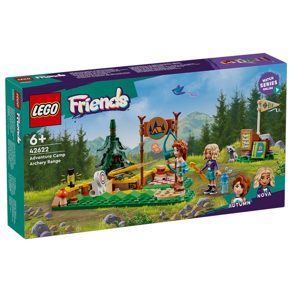 LEGO® Friends 冒險營射箭場(42622)拼砌玩具適合 6 歲以上孩子,配有小秋與諾娃樂高娃娃、浣熊和多種運動配件。女孩與男孩可用這款精采盒組上演真正的射箭練習,因為弓真的能射箭。看箭靶被箭擊中時向下翻轉!裡面有以顏色區分的不同難度,讓孩子能把角色向後移,進行更大的挑戰。
