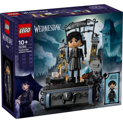 Wednesday Addams Figure(76780)盒組中有謎團與混亂等著 10 歲以上孩子。此樂高® 星期三禮品盒組內有值得收藏、可擺姿勢的模型,頭、手臂與腳可動,還有 2 張臉孔和 2 套服裝,讓玩家能重新拼砌玩偶。這款盒組包含她忠實的搭檔小手與底座,底座有玩具黑色大理花,還有 2 個隱藏空間,能擺放她的銳舞會禮服或制服等寶物。裡面還有奈落學院大門和星期三的配件,包括她的打字機、Nero 的墳墓、水晶球等等。