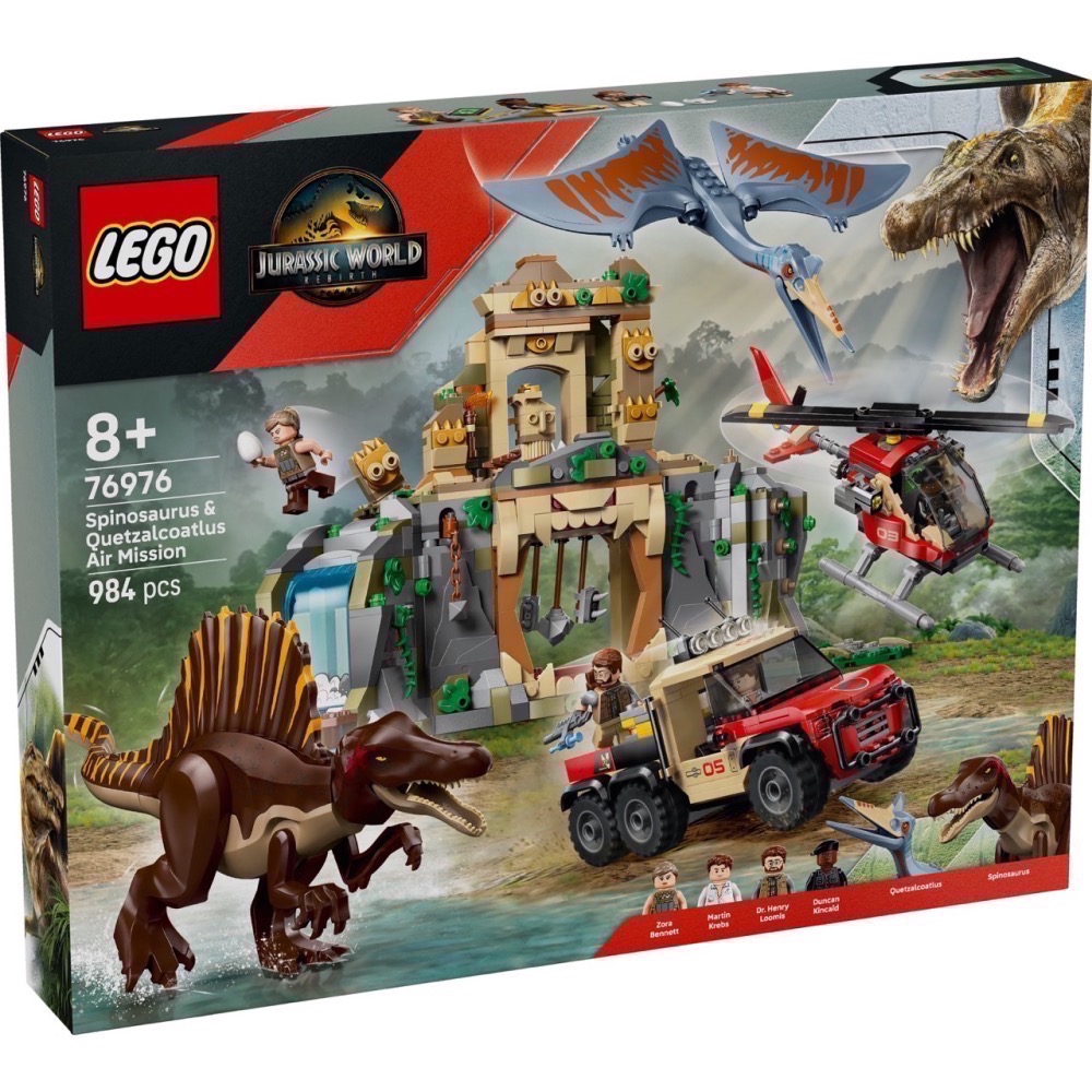- 侏羅紀世界電影角色套組– 包含 2 隻模製恐龍(棘背龍與翼龍)、4 位電影人偶、一座古代神殿、直升機與恐龍卡車,內容豐富