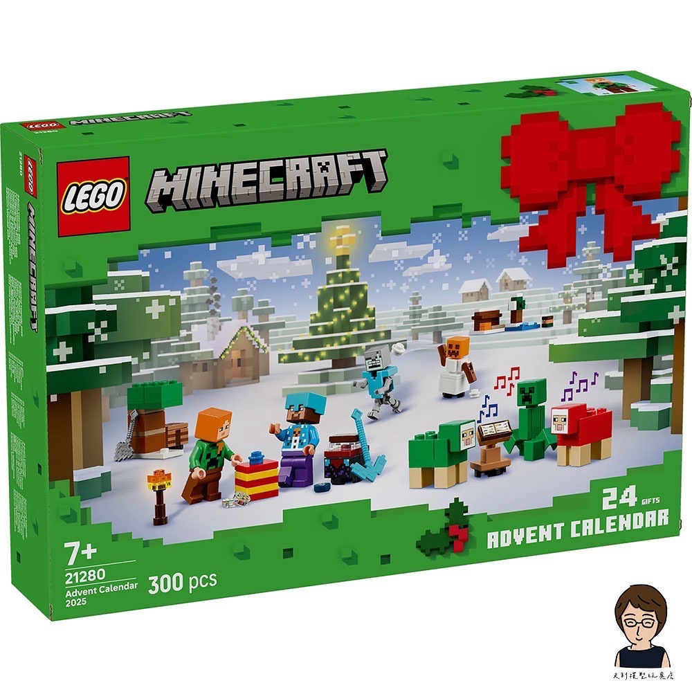 24 扇門後均有 1 份每日禮物等著孩子在倒數耶誕節來臨期間發現。人偶包括身穿苦力怕™ 毛衣的愛莉克斯;身穿雪人毛衣、戴著鑽石頭盔並拿著十字鎬的史提夫;在甜莓灌木叢旁邊的苦力怕;拿著三叉戟的水鬼;身穿鑽石護甲的迷途骷髏;雪人;拿著附魔斧頭的殭屍;以及配有熔爐的聖誕老人村民。裡面還有許多孩子會認得出自超人氣遊戲的小型拼砌玩具和酷炫配件。隨著大日子接近,孩子可結合這些禮物,打造迷你 Minecraft 冬季村,自創無數充滿想像力的冒險。此盒組甚至還有可展開的遊戲墊,提供最完美的背景。