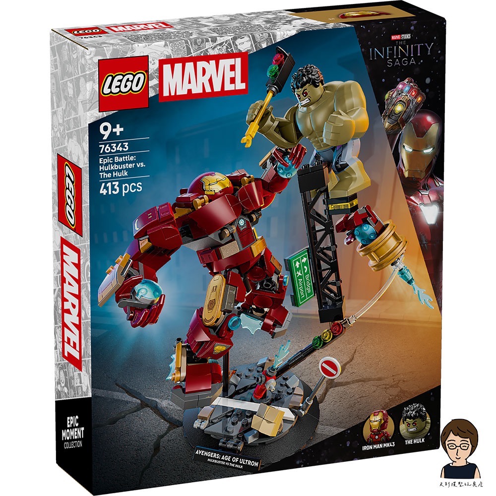 暢玩 LEGO® ǀ Marvel 史詩級對決:浩克毀滅者 vs. 浩克(76343),讓漫威影業《復仇者聯盟 2:奧創紀元》的精彩場景活靈活現。此拼砌盒組適合 9 歲以上男孩與女孩。這款引人入勝的拼砌盒組內有鋼鐵人和綠巨人浩克人偶,還有經典的浩克毀滅者裝甲,為孩子帶來無數充滿想像力的角色扮演與創意展示可能性。 在充滿瓦礫和倒塌鋼骨的街道場景中,鋼鐵人借助浩克毀滅者裝甲的力量與綠巨人浩克對戰。街上還有紅綠燈,綠巨人浩克可拿來當武器。浩克毀滅者裝有活動彎節,充分提升可動性。有了堅固底座與銘牌,孩子可用模型當作房間飾品,或拆開人偶,打造屬於自己的超級英雄冒險。這款盒組是絕佳送禮點子,而 LEGO Builder 應用程式讓孩子能夠自信拼砌-用容易理解的數位拼砌說明縮放、旋轉 3D 模型和追蹤進度。此拼砌盒組包含 413 個零件。
