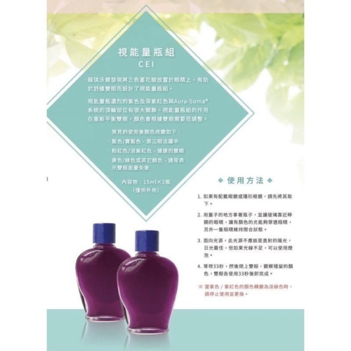 Aura-soma悠活系列~視能量瓶組 內容物:15ml*2瓶 (不能用,只能看) ♥薇琪沃爾發現將三色堇花瓣放置於眼睛上,有助於舒緩雙眼而設計了視能量瓶組。 ♥視能量瓶濃烈的紫色及深紫紅色與Aura-soma系統的頂輪部位有很大關聯。 ♥視能量瓶組的作用在重新平衡雙眼,顏色會根據雙眼需要而調整。 常見的使用後顏色改變如下: ♥藍色/寶藍色-第三眼活躍中 ♥粉紅色/淡紫色-健康的雙眼 ♥黃色/綠色或其它顏色-通常表示雙眼能量失衡 使用方法: 1.如果有配載眼鏡或隱形眼鏡,請先將其取下 2.用蓋子的地方拿著瓶子,並讓玻璃靠近睜開的眼睛,讓有顏色的光能夠穿透眼睛,另一隻眼睛維持閉合的狀態。 3.面向光源,此光源不應該是直射的陽光,日光最佳,但如果光線不足,可以使用燈泡。 4.等待33秒,然後閉上雙眼,觀察殘留的顏色,雙眼各使用33秒後即 完成。 ▲當紫色/紫紅色的顏色轉變為淡綠色時,請位止使用並更換。 https://s-cf-tw.shopeesz.com/file/tw-11134208-7qul2-lkfd47kn4mrc69