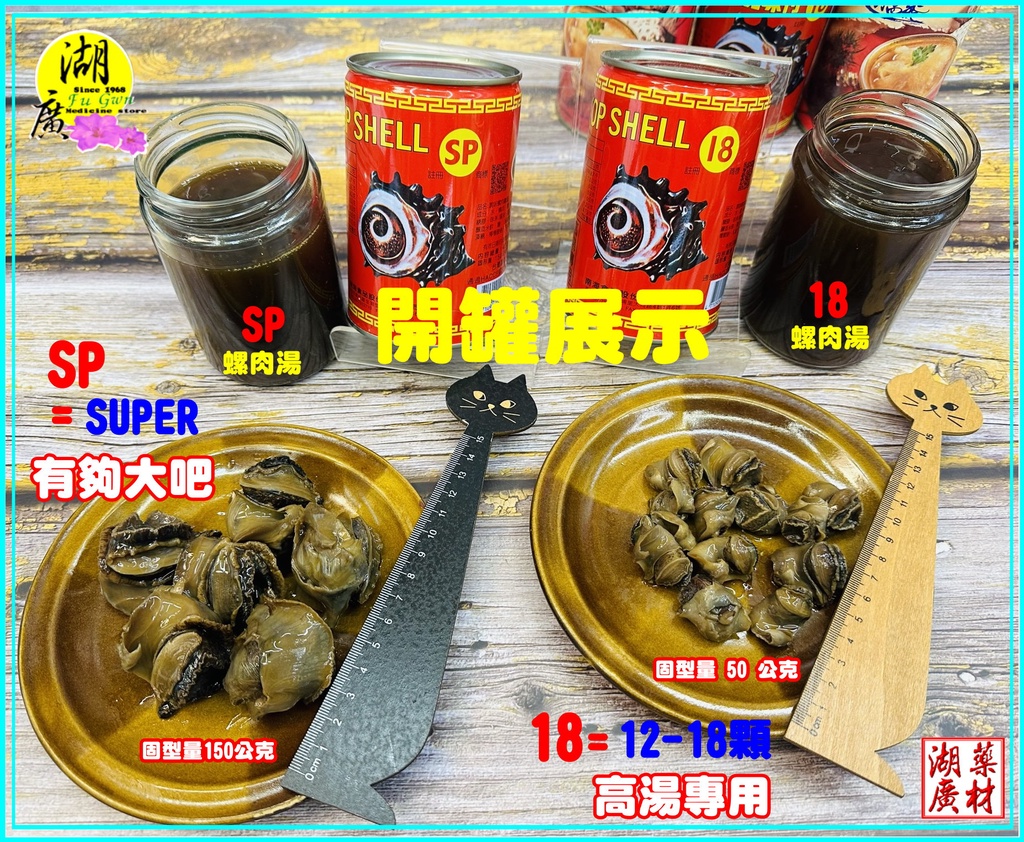 一般普羅大眾,家庭使用都是 螺肉與湯頭兼顧,所以下一罐SP號,再下一罐18號螺肉. 螺肉與湯頭 完美比例, 鮮美好喝.
