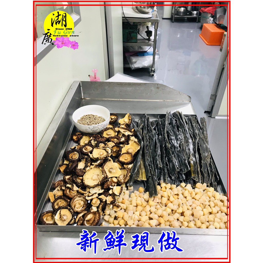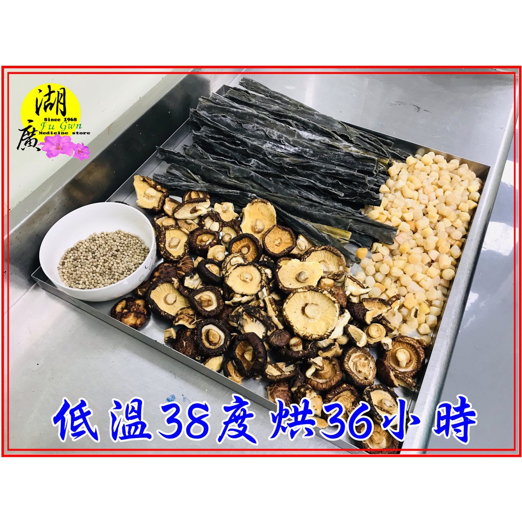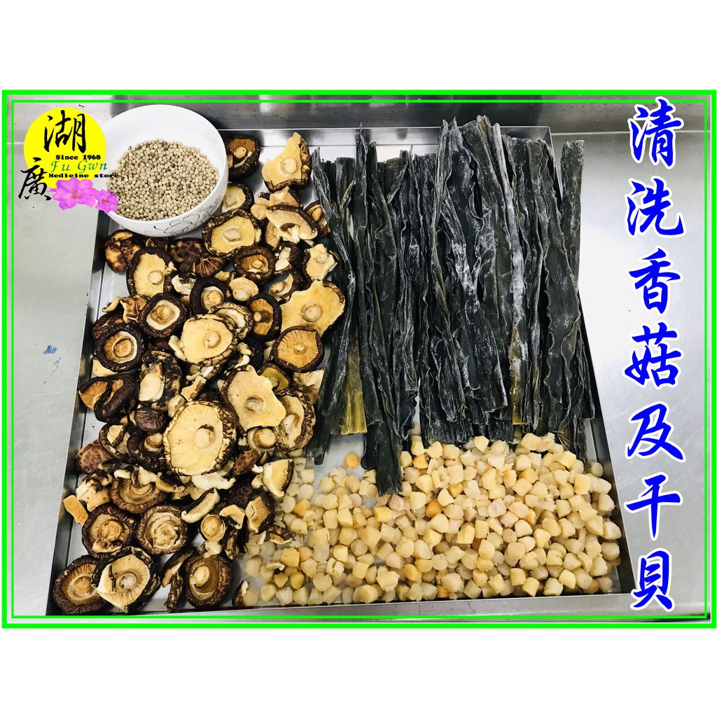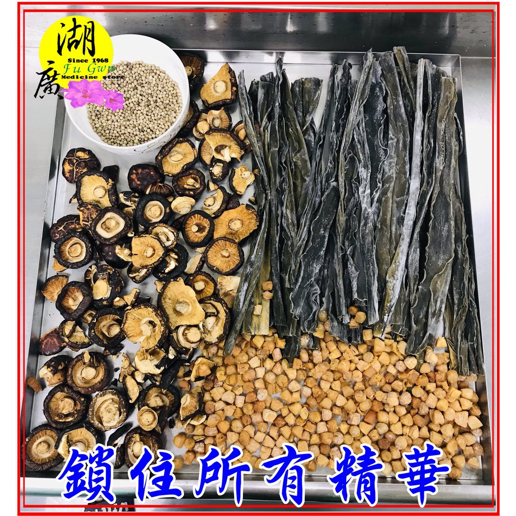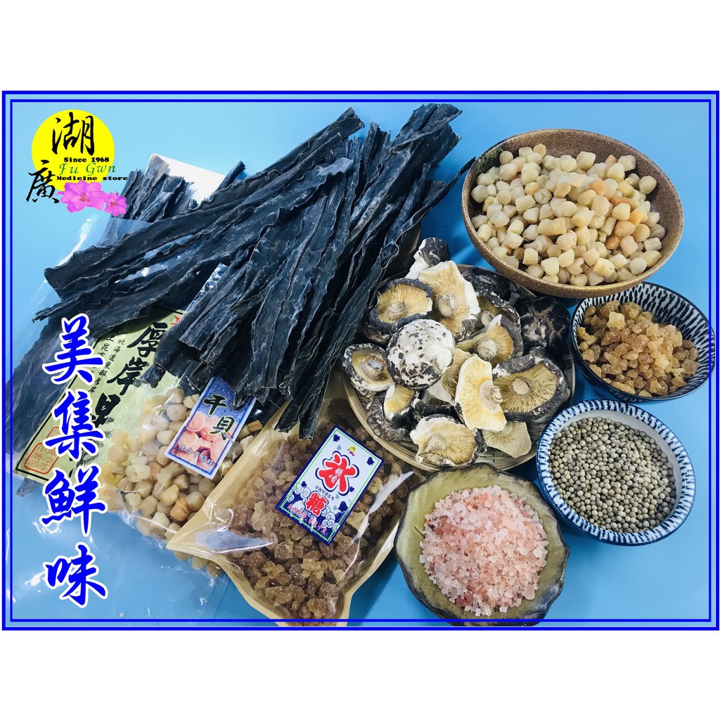 特上級日本厚岸昆布, 山東與日本海域小干貝,台灣埔里香菇(破皮及破的) 白胡椒粒,黃色糖香冰糖 喜馬拉雅山