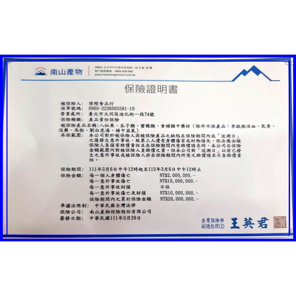 南山產品責任險第0900-2236005581-09保單最高2000萬元