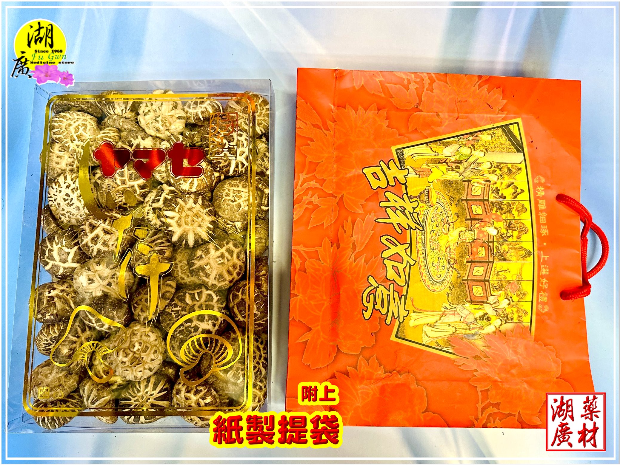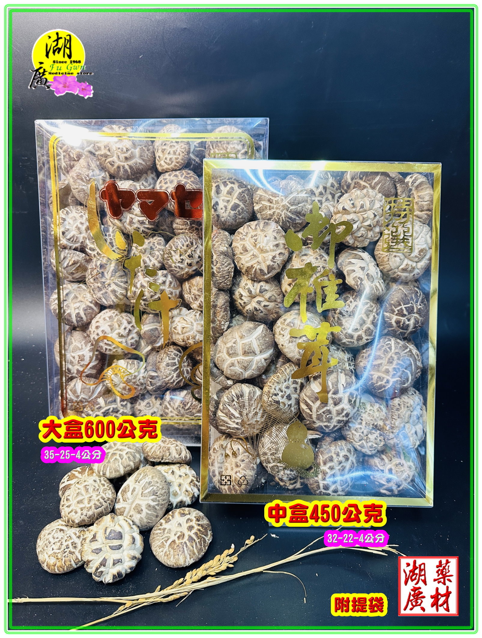 不論送禮或者自用皆為最佳選擇. 本禮盒花菇 內容物淨重 大盒600公克. 中盒450公克 小盒300公克 附贈高級提袋一只.