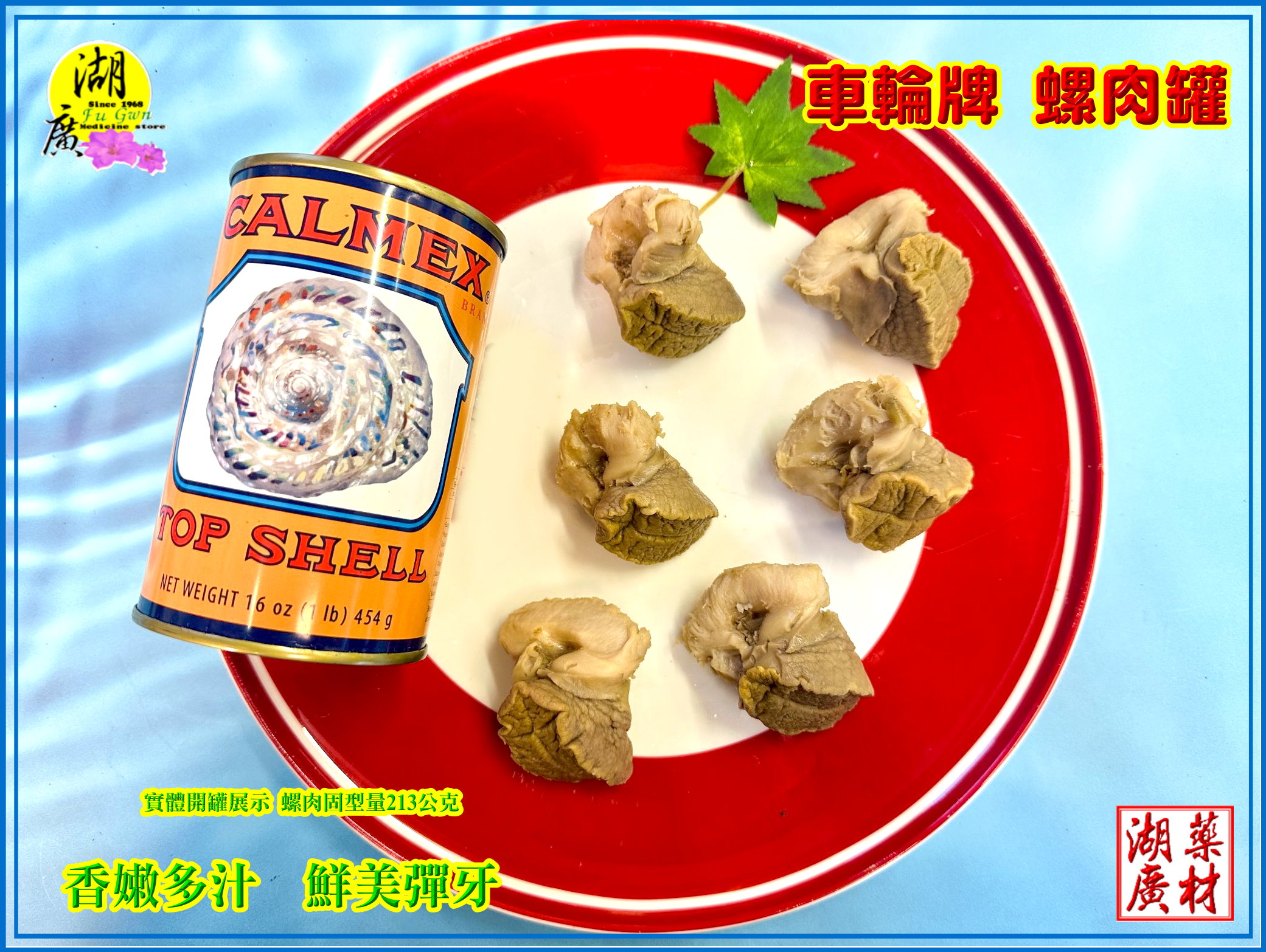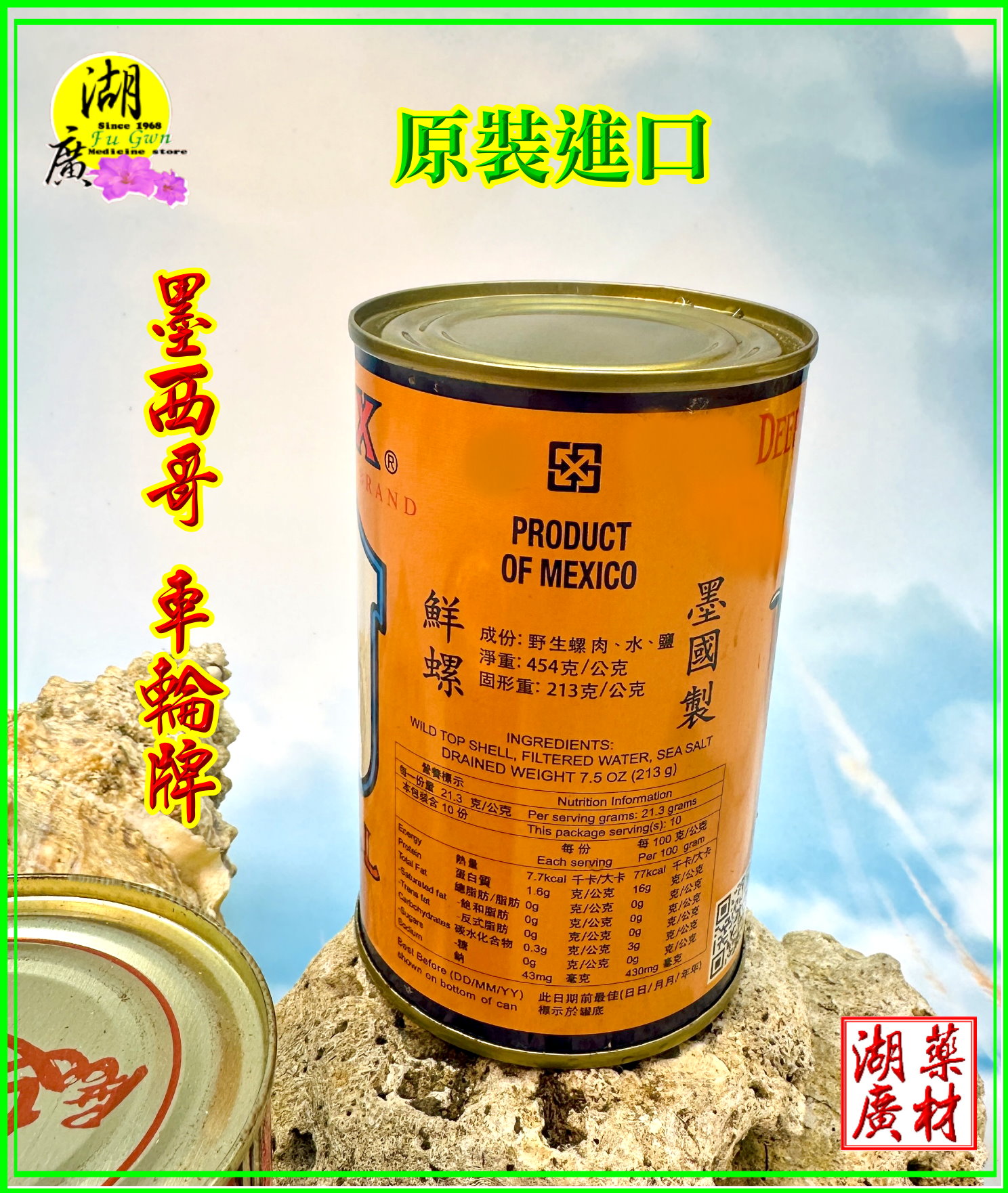 墨西哥 車輪牌 鮮螺肉. 每罐454公克,454公克是有含螺肉鮮湯的重量, 每罐螺肉固型量保證有 213公克,又肥又大,鮮美彈牙,如照片中,