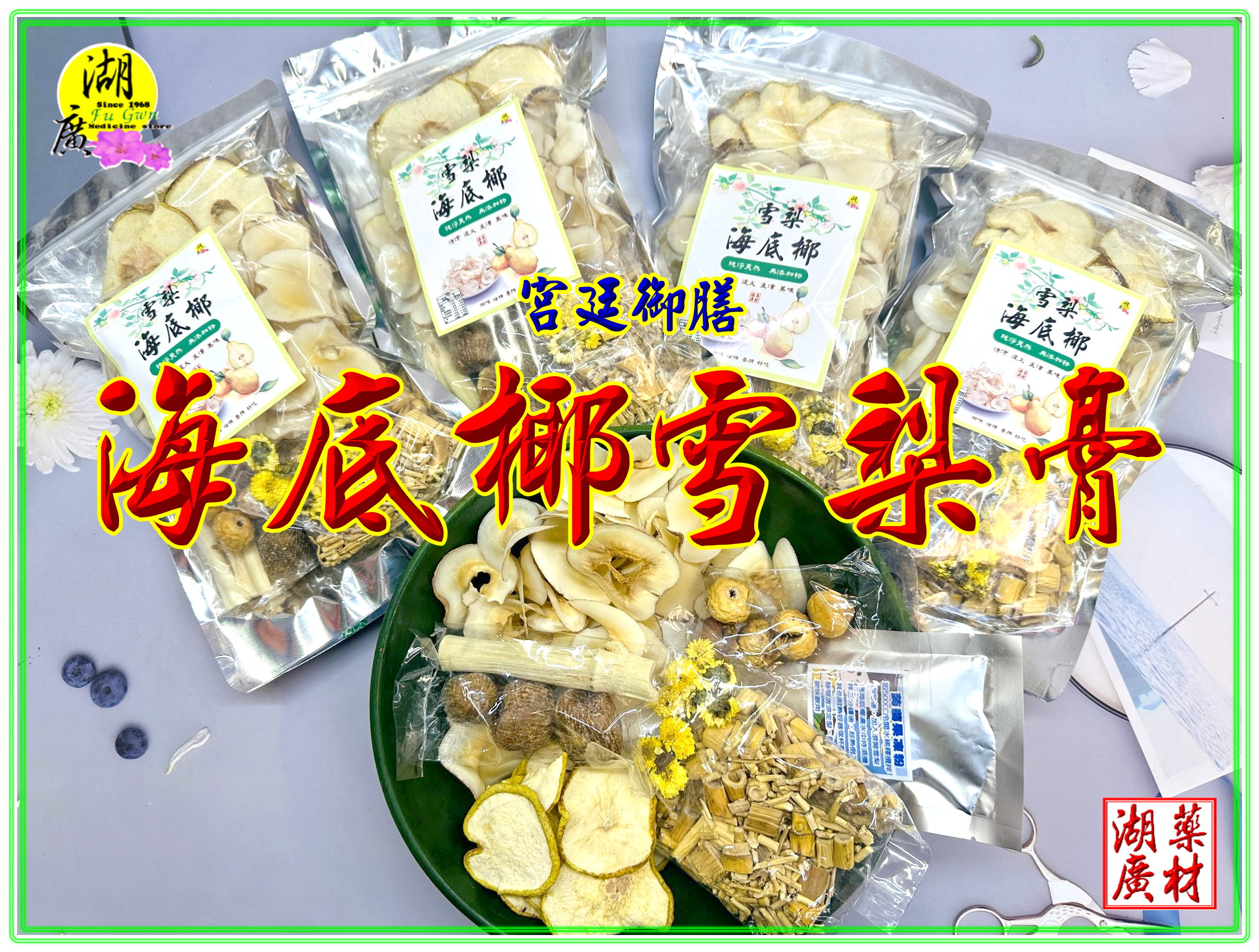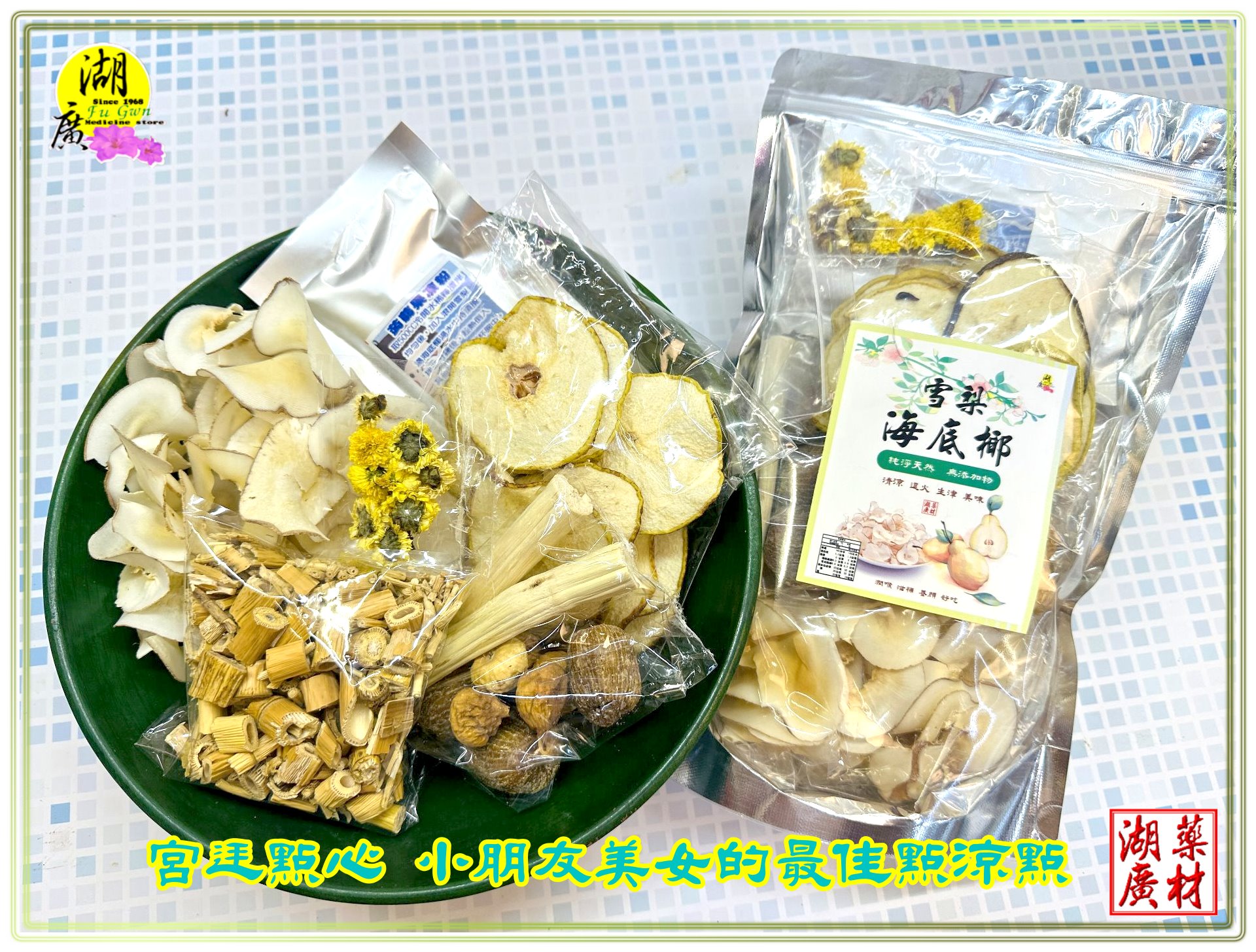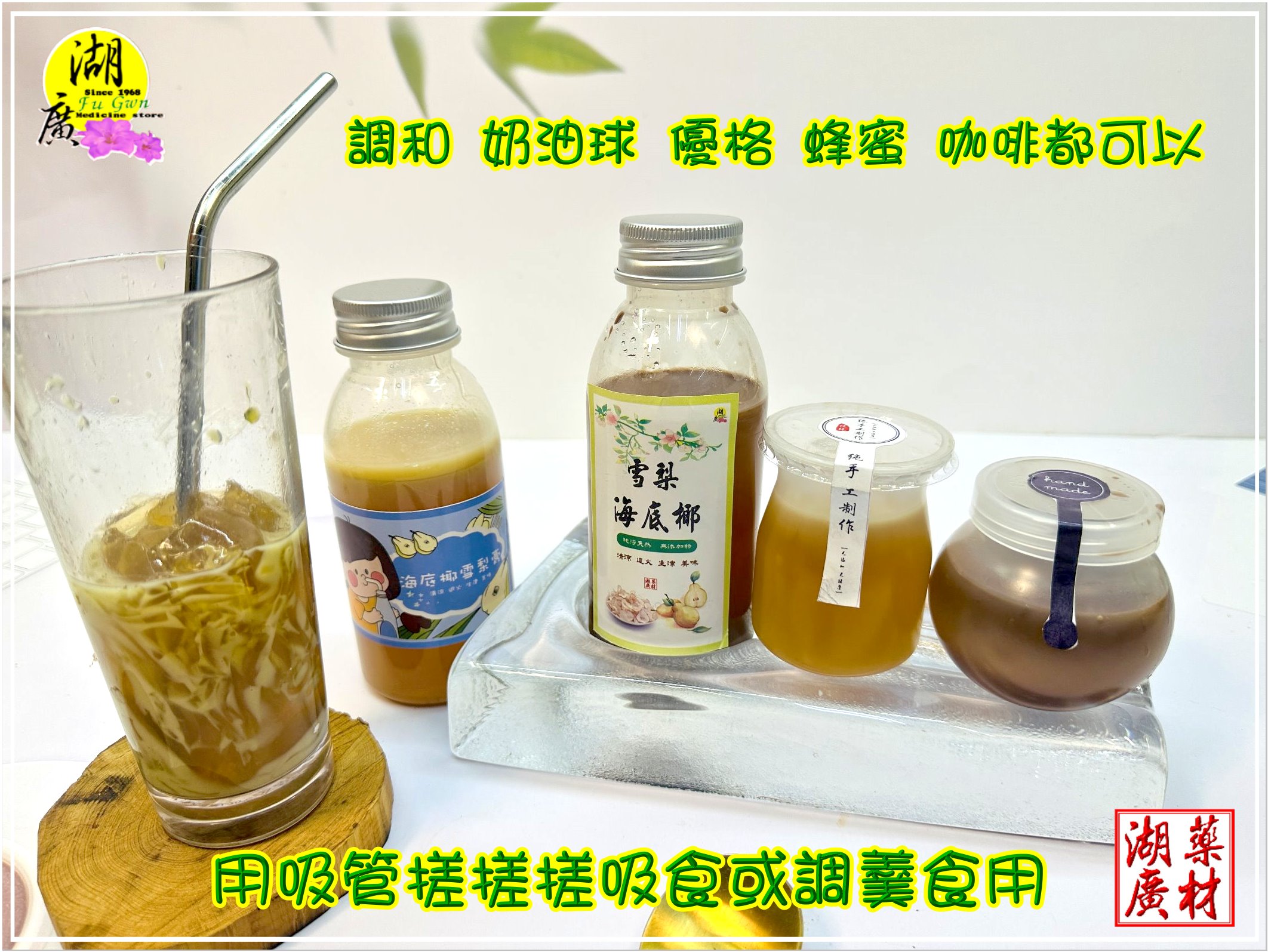 海底椰雪梨膏 由 海底椰 雪梨乾 白茅根 白甘蔗 無花果 金絲蜜棗 白蘆根 台灣菊花 所組合而成,附蒟蒻粉一包