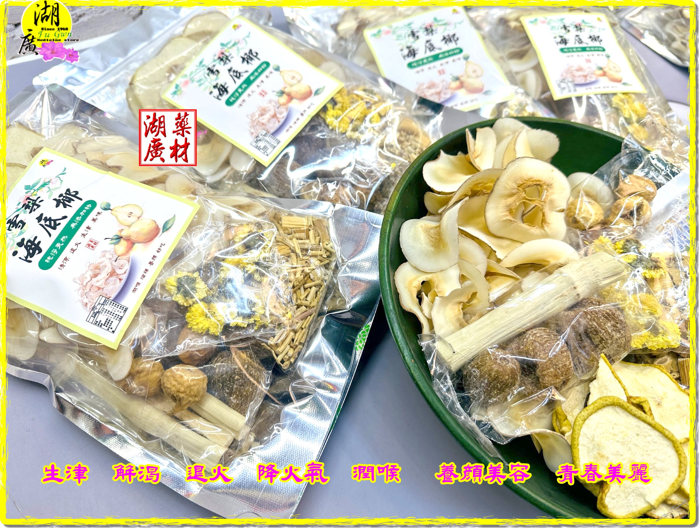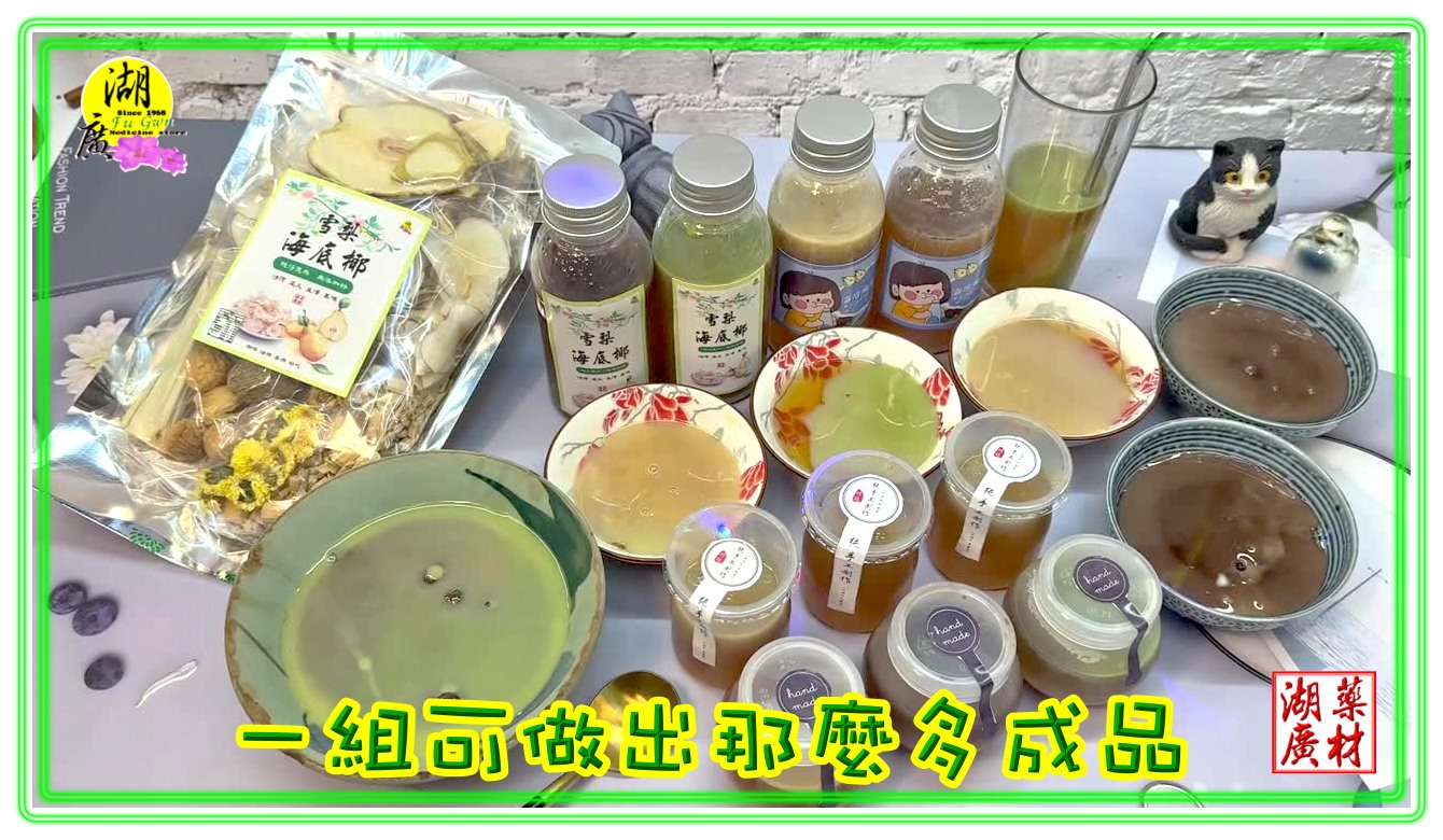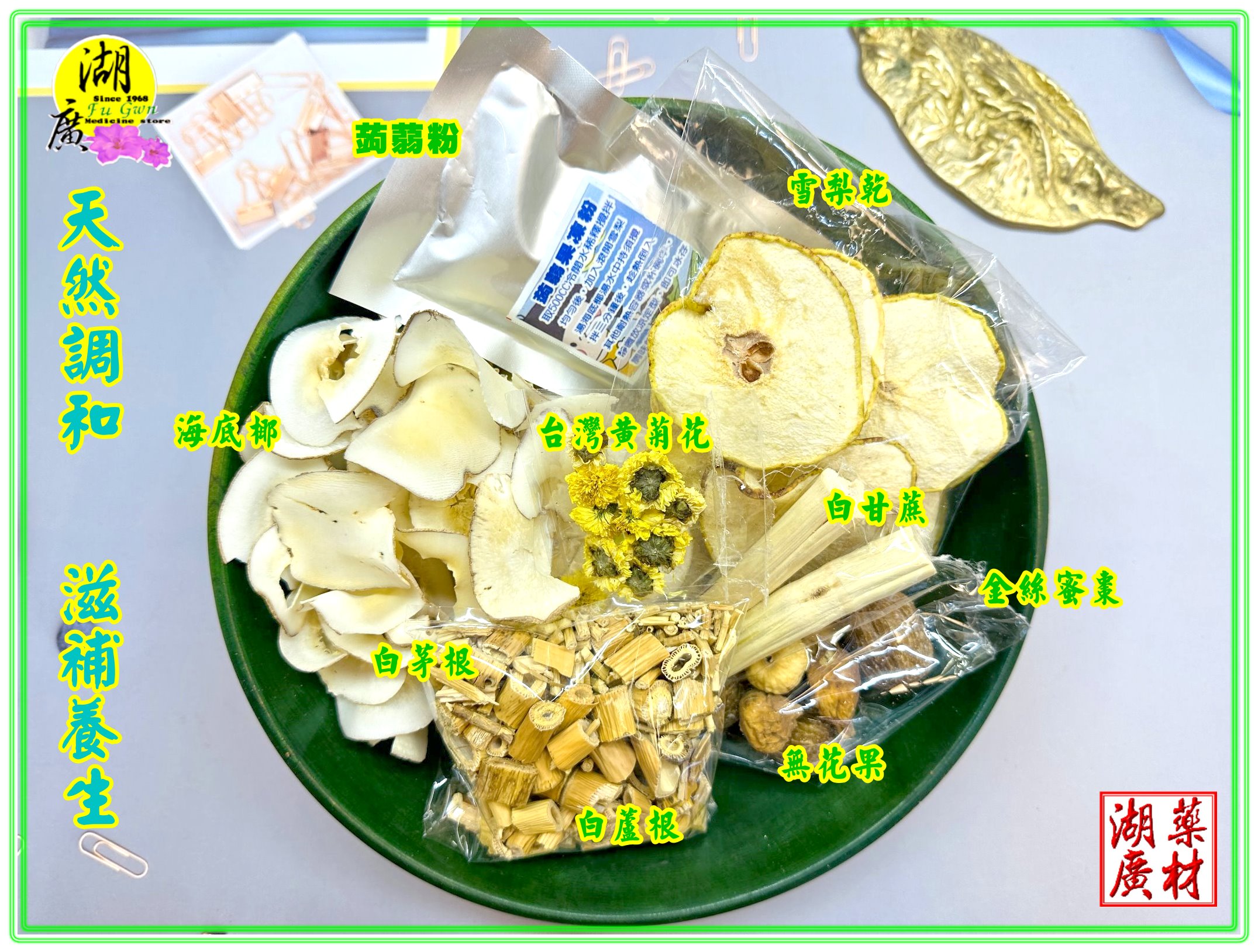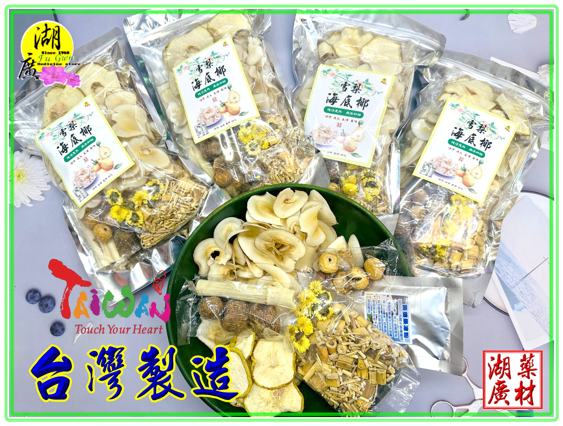 海底椰雪梨膏 由 海底椰 雪梨乾 白茅根 白甘蔗 無花果 金絲蜜棗 白蘆根 台灣菊花 所組合而成,附蒟蒻粉一包