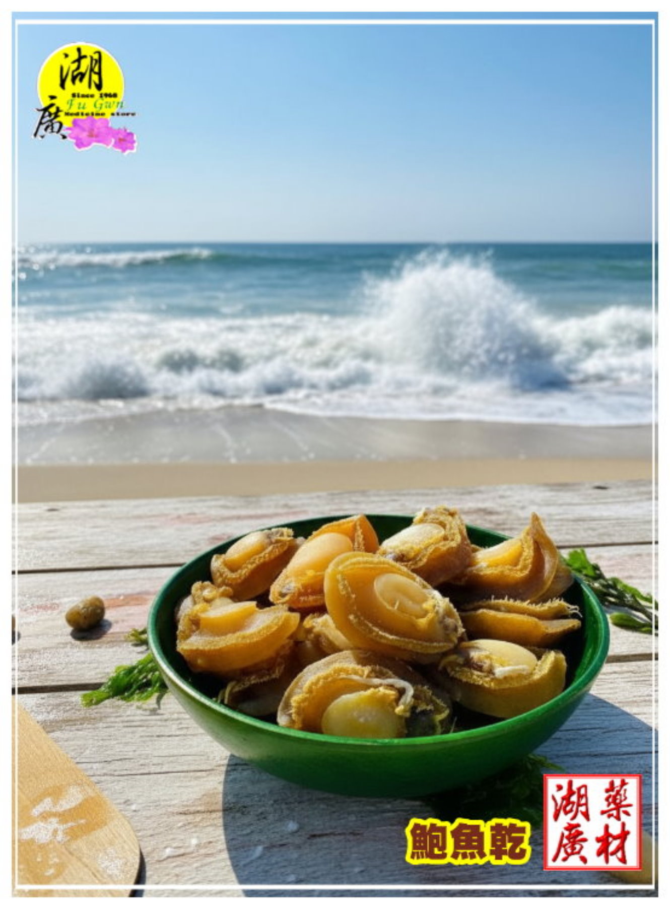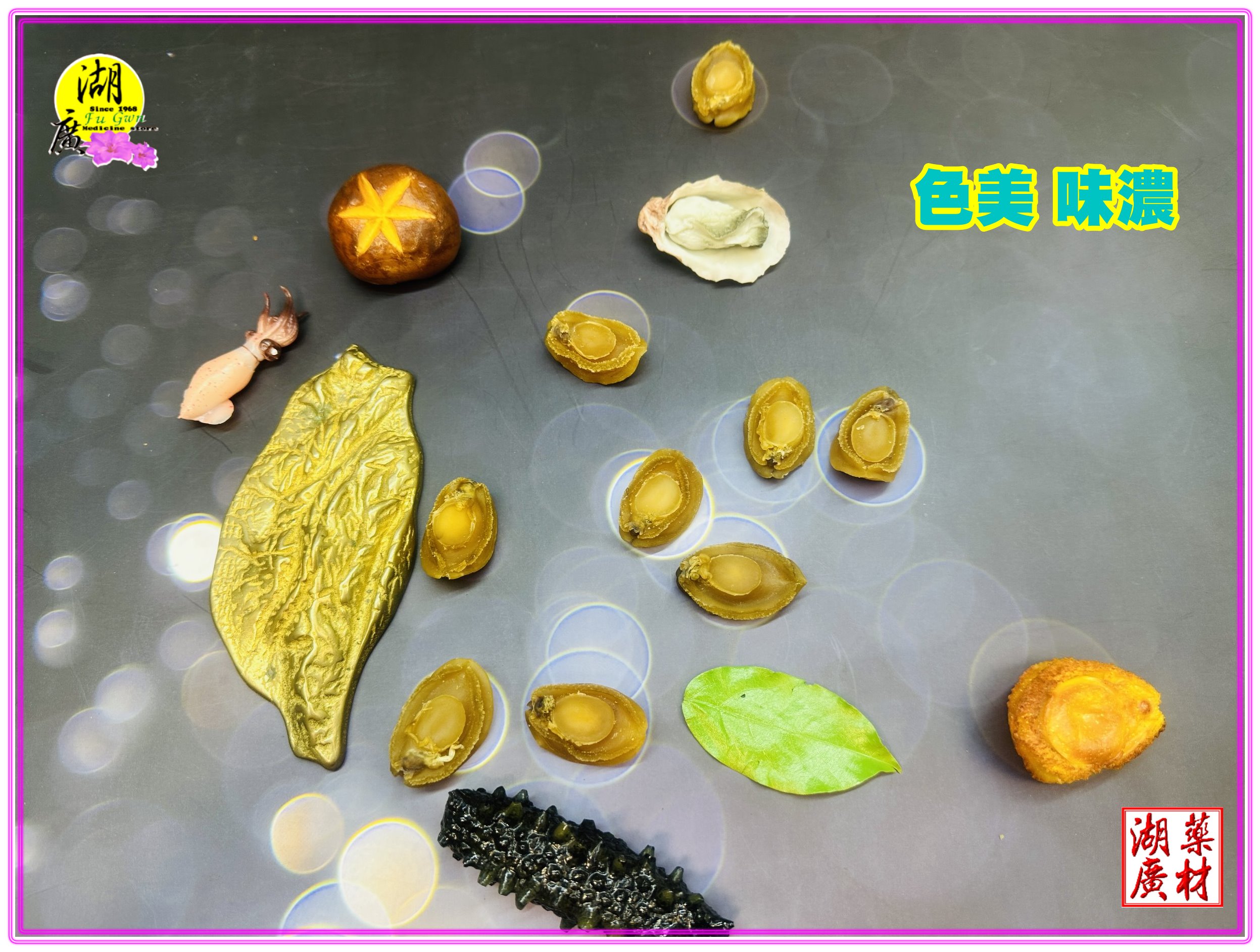 鮑魚乾 結實,沉重,光亮美麗,外型酷似金元寶,枕邊高挺不下垂(表示鮑魚是在最鮮狀態曬製),入口有嚼勁.