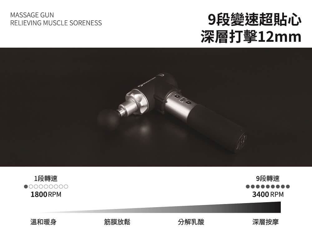 市面最強按摩槍-Booster Pro2,擁有9段調節、6款按摩頭,附一年保固