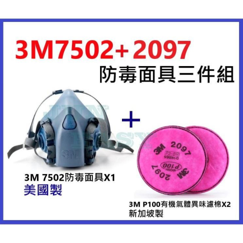 內容:3M 7502面罩主體(美國製)x1個、3M 2097 P100等級有機氣體異味防塵濾棉片(韓國製)x2片