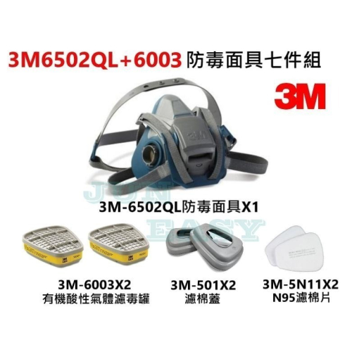 單位:ㄧ組(7件式) 內容:6502QL快拆式面罩主體x1(美國製)、6003有機酸性氣體濾毒罐x2、5N11濾棉片x2、501濾棉蓋x2