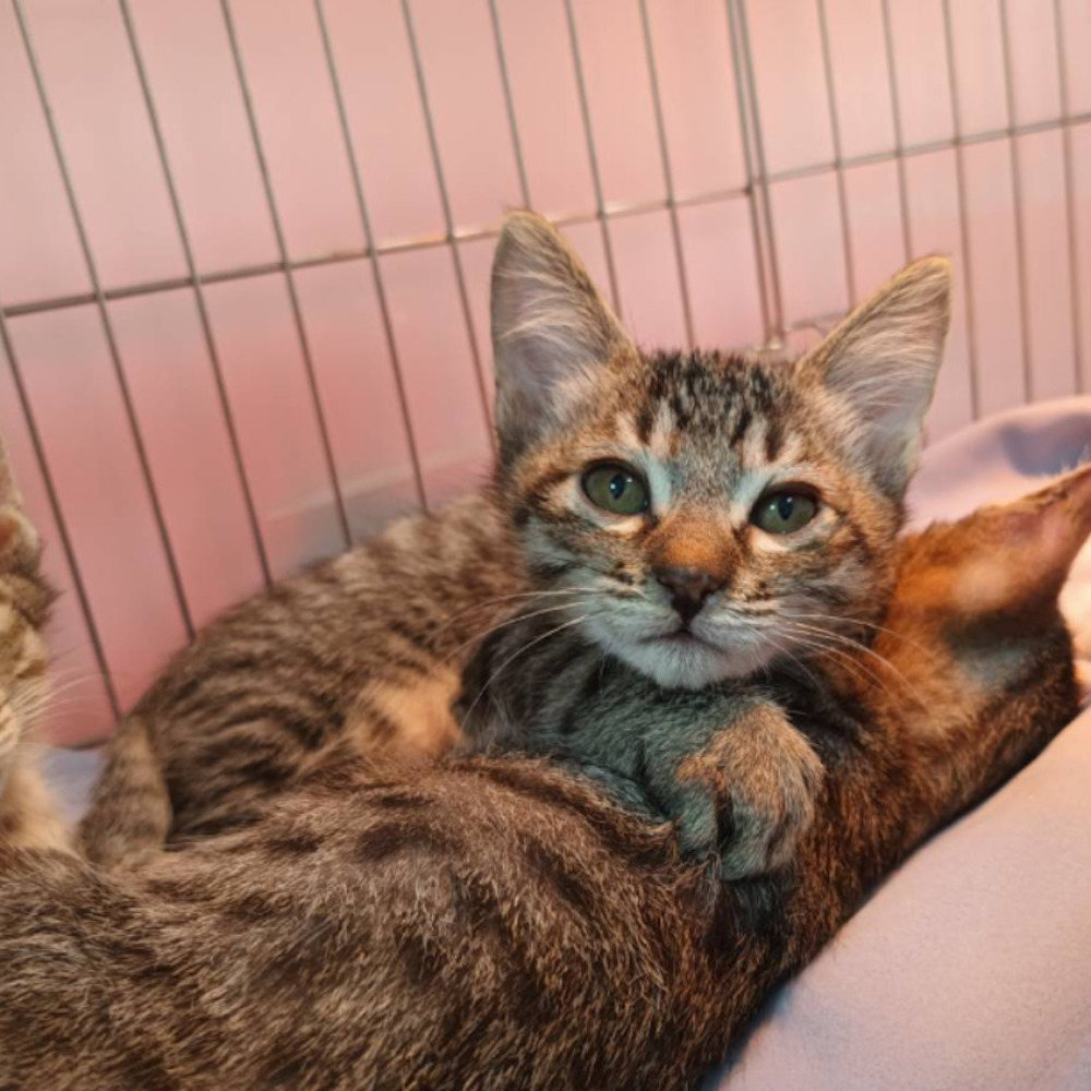 我是長期救援流浪狗、流浪貓的愛心志工,現在在新北市板橋區公立動物之家有一窩可愛的米克斯虎斑貓,其中有一隻特別的小公貓叫阿虎。阿虎的鼻頭帶著獨特的橘色光澤,或許是來自父母遺傳的橘貓基因,讓他在眾多虎斑貓中顯得特別可愛又有辨識度。然而,這樣一隻討喜的小貓,卻有著不為人知的流浪經歷。他和兄弟姐妹曾在寒冷的雨夜蜷縮在一個廢棄的沙發縫隙裡,驚恐地忍受著飢餓和寒冷,依靠彼此的溫暖才堅持下來。當志工發現他們時,他們虛弱得連喵聲都無法發出,阿虎的小身影尤其讓人心疼,但他的眼神中依然閃爍著對生命的渴望。如今,阿虎和他的兄弟姐妹們已在動物之家恢復了健康,他親人又撒嬌的性格讓每個見過他的人都深深喜愛。阿虎期待一個溫暖的家,和他一起分享他對生命的熱情與愛,讓這段悲傷的過去成為他幸福未來的起點。希望您能成為改變阿虎和他家族命運的那個人,給予他們一個充滿愛的家園。