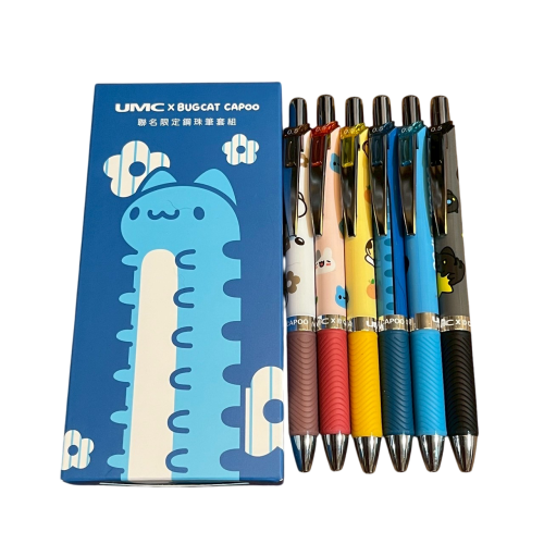 全新,原廠盒裝,功能正常。結帳需滿 99 才出貨,減少包材與碳排放。UMC × 咖波聯名限定鋼珠筆套組,內容物 黑筆×3 + 藍筆×2 + 紅筆×1,共6入,材質 不鏽鋼、ABS、墨水,尺寸 約直徑1.1 × 高14.8cm ±5%。