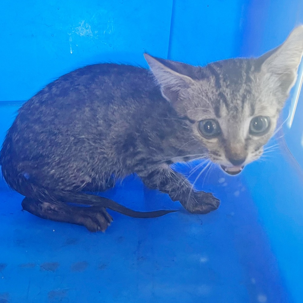 我是長期救援流浪狗、流浪貓的愛心志工,現在在新北市中和區公立動物之家,有一隻超迷人的虎斑小母貓,正眨著星星眼等待命中注定的家人!她有個可愛的名字叫「虎妞」,是在景平路一個飄著細雨的傍晚,被好心人發現瑟縮在濕透了的盆栽裡的寶貝。當時的她只有巴掌大,渾身髒兮兮卻不哭不鬧,只用一雙圓溜溜、琥珀色的大眼睛信任地看著救援者,彷彿在說:「我知道你會幫我。」