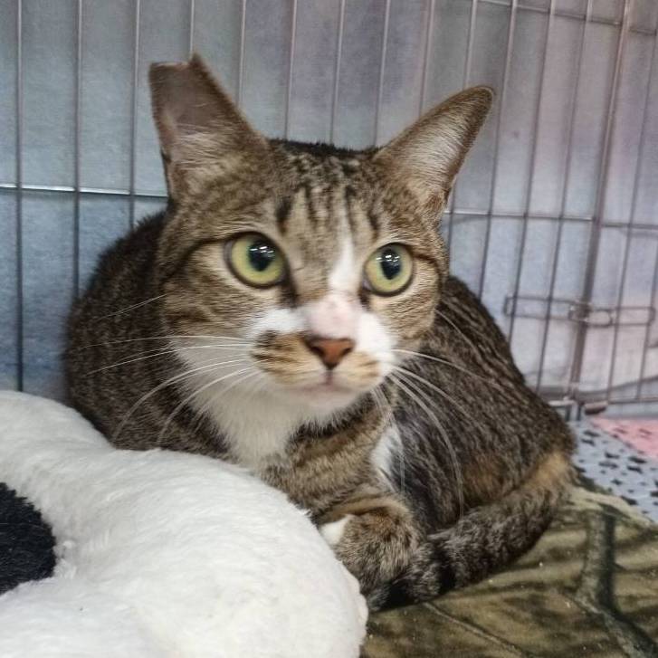 她是白底虎斑母貓,在板橋松柏街馬路前的蔬果店被發現,當時戴著藍色項圈,疑似曾被放養,但經多方協尋仍未找到原飼主,已依法公告並開放領養。