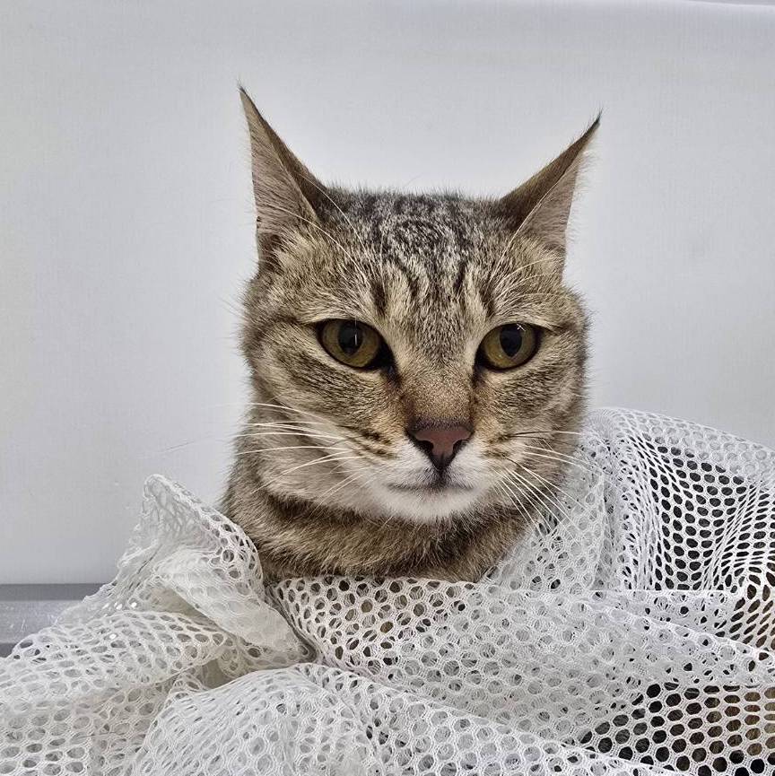 米米有著溫暖的虎斑紋路,和一雙會說話的金色眼睛。她乖巧得讓人心疼,只要你伸出手,她就會輕輕靠上來,享受撫摸,發出滿足的呼嚕聲。她不僅親人,也親貓,彷彿在默默說著:「我願意,再一次成為誰家裡的一份子。」