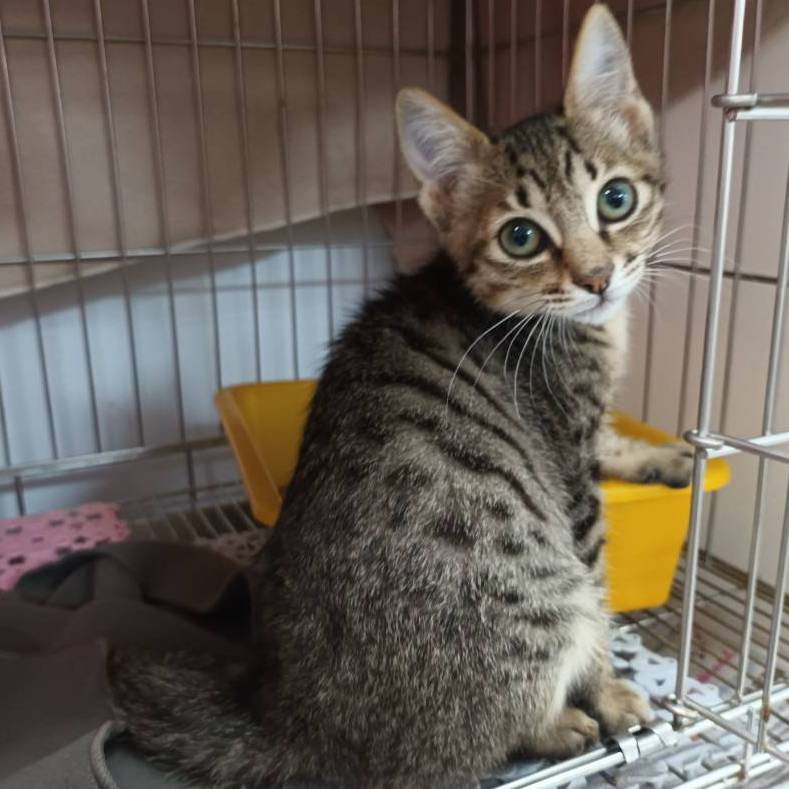 我是長期救援流浪狗、流浪貓的愛心志工,今天想和大家介紹板橋動物之家這隻特別的小虎斑。她叫「小小」,是愛心民眾在板橋中正路旁發現的,當時她躲在機車底下,瘦小的身軀不斷發抖,卻還是努力發出微弱的呼嚕聲,彷彿在說:「救救我好嗎?」