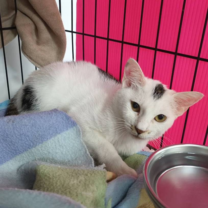 我是長期救援流浪狗、流浪貓的愛心志工。今天想跟大家介紹一位特別的小女生——她現在住在新北市中和動物之家,是一隻虎斑白貓,頭上頂著一撮斜瀏海,像永遠綁不好頭髮的小女孩,可愛得讓人忍不住想多看幾眼。