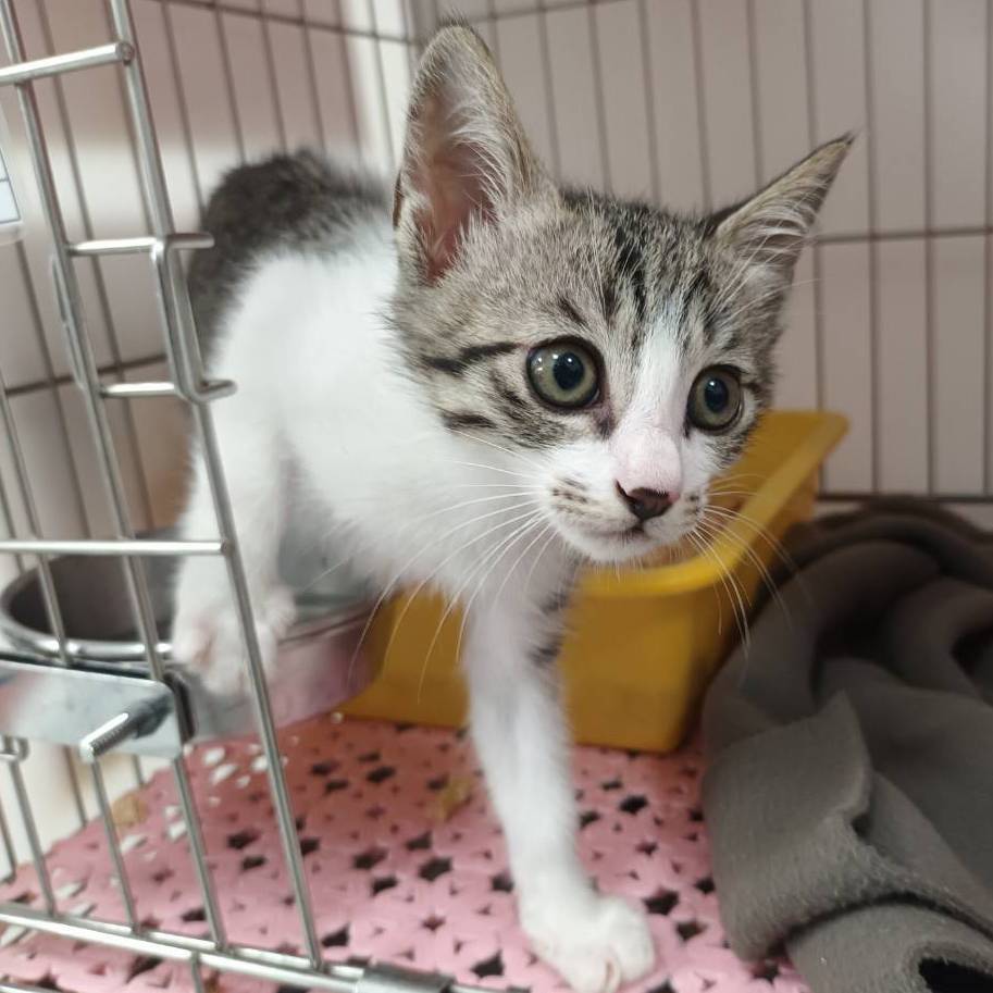 我是長期救援流浪狗、流浪貓的愛心志工,現在在板橋動物之家,有一隻虎斑白小貓正等著一個永遠的家。他是個小男生,愛心民眾在樹林高中附近的草叢裡發現他時,他正瑟瑟發抖地縮在草叢裡,身邊沒有媽媽,也沒有兄弟姊妹,眼睛還沒退藍膜,卻已經學會用微弱的叫聲求救。