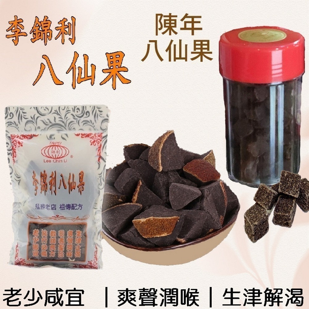 李錦利頂級陳年八仙果 陳年香濃型 八仙果 100g/罐 💢塑料瓶裝,非密封裝,無加貼中文標籤,常溫保存即可。 成份:李錦利秘方、葡萄柚、金桔、金棗、陳皮、甘草、佛手果、薄荷、麥芽