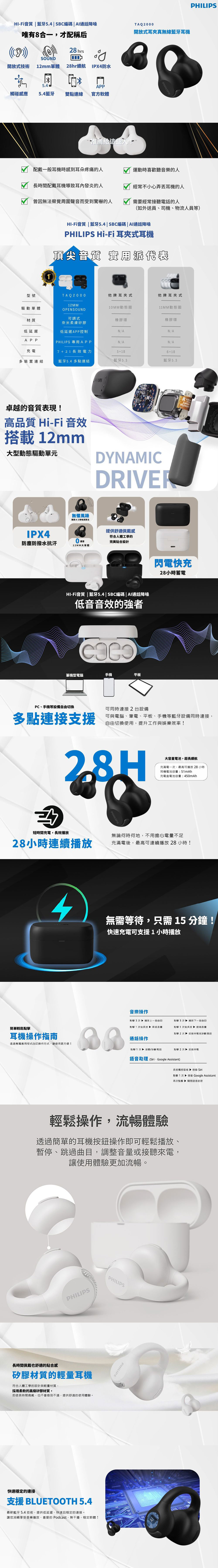 PHILIPS 飛利浦 GO系列 耳夾式真無線藍牙耳機 TAQ2000