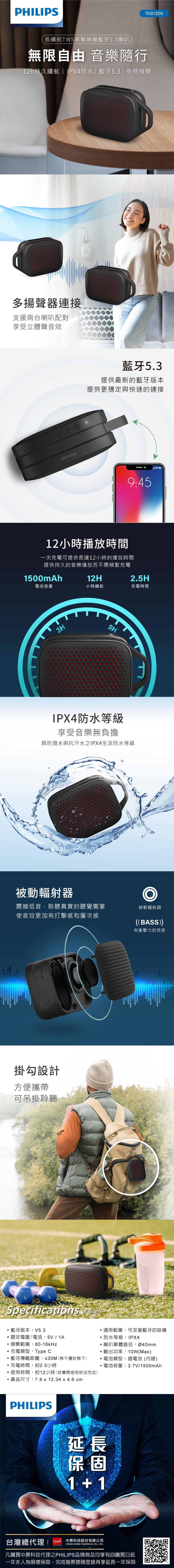 PHILIPS 飛利浦 長續航TWS串聯無線藍牙5.3喇叭 TAS1209 (2/1-2/28贈品)