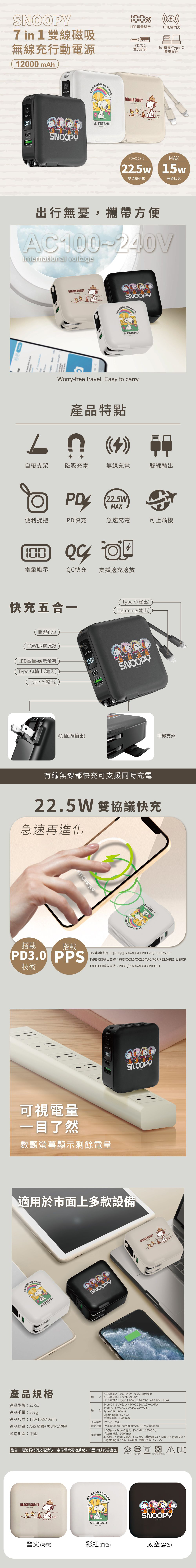 SNOOPY 史努比 12000mAh 七合一雙線磁吸無線充行動電源 ZJ-51