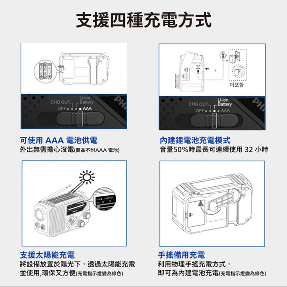✦支援四種充電方式:AAA電池供電、內建鋰電池充電、支援太陽能充電與手搖式充電