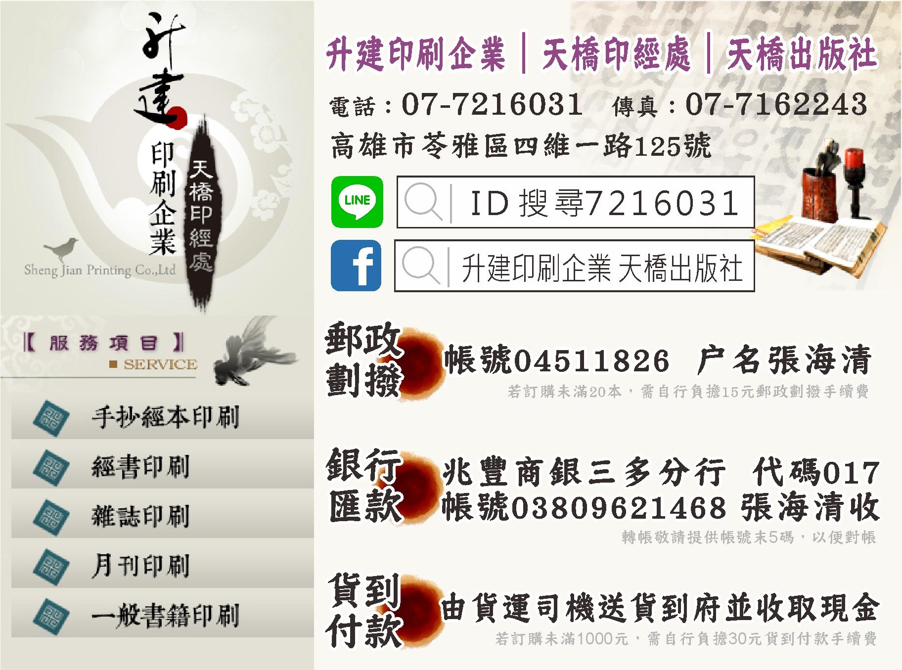 <p><font face="Helvetica Neue, Helvetica, Arial, 文泉驛正黑, WenQuanYi Zen Hei, Hiragino Sans GB, 儷黑 Pro, LiHei Pro, Heiti TC, 微軟正黑體, Microsoft JhengHei UI, Microsoft JhengHei, sans-serif"><span style="font-size:14px;">■■本賣場全面台灣製造■全部繁體中文■■</span></font></p><p><font face="Helvetica Neue, Helvetica, Arial, 文泉驛正黑, WenQuanYi Zen Hei, Hiragino Sans GB, 儷黑 Pro, LiHei Pro, Heiti TC, 微軟正黑體, Microsoft JhengHei UI, Microsoft JhengHei, sans-serif"><span style="font-size:14px;"><br /></span></font></p><p><font face="Helvetica Neue, Helvetica, Arial, 文泉驛正黑, WenQuanYi Zen Hei, Hiragino Sans GB, 儷黑 Pro, LiHei Pro, Heiti TC, 微軟正黑體, Microsoft JhengHei UI, Microsoft JhengHei, sans-serif"><span style="font-size:14px;">=====================</span></font></p><p><font face="Helvetica Neue, Helvetica, Arial, 文泉驛正黑, WenQuanYi Zen Hei, Hiragino Sans GB, 儷黑 Pro, LiHei Pro, Heiti TC, 微軟正黑體, Microsoft JhengHei UI, Microsoft JhengHei, sans-serif"><span style="font-size:14px;">📦出貨時間---<font color="#000000" style="background-color:rgb(255,255,0);"><b><span style="font-size:18px;">週一~週五</span></b></font></span></font></p><p><font face="Helvetica Neue, Helvetica, Arial, 文泉驛正黑, WenQuanYi Zen Hei, Hiragino Sans GB, 儷黑 Pro, LiHei Pro, Heiti TC, 微軟正黑體, Microsoft JhengHei UI, Microsoft JhengHei, sans-serif"><span style="font-size:14px;"><br /></span></font></p><p><font face="Helvetica Neue, Helvetica, Arial, 文泉驛正黑, WenQuanYi Zen Hei, Hiragino Sans GB, 儷黑 Pro, LiHei Pro, Heiti TC, 微軟正黑體, Microsoft JhengHei UI, Microsoft JhengHei, sans-serif"><span style="font-size:14px;"><i>16:00前下單➡️當日出貨</i></span></font></p><p><font face="Helvetica Neue, Helvetica, Arial, 文泉驛正黑, WenQuanYi Zen Hei, Hiragino Sans GB, 儷黑 Pro, LiHei Pro, Heiti TC, 微軟正黑體, Microsoft JhengHei UI, Microsoft JhengHei, sans-serif"><span style="font-size:14px;">16:00<b>後</b>下單➡️次一工作日出貨</span></font></p><p><font face="Helvetica Neue, Helvetica, Arial, 文泉驛正黑, WenQuanYi Zen Hei, Hiragino Sans GB, 儷黑 Pro, LiHei Pro, Heiti TC, 微軟正黑體, Microsoft JhengHei UI, Microsoft JhengHei, sans-serif"><span style="font-size:14px;">每週六日/連續假日➡️固定公休</span></font></p><p><font face="Helvetica Neue, Helvetica, Arial, 文泉驛正黑, WenQuanYi Zen Hei, Hiragino Sans GB, 儷黑 Pro, LiHei Pro, Heiti TC, 微軟正黑體, Microsoft JhengHei UI, Microsoft JhengHei, sans-serif"><span style="font-size:14px;"><br /></span></font></p><p><font face="Helvetica Neue, Helvetica, Arial, 文泉驛正黑, WenQuanYi Zen Hei, Hiragino Sans GB, 儷黑 Pro, LiHei Pro, Heiti TC, 微軟正黑體, Microsoft JhengHei UI, Microsoft JhengHei, sans-serif"><span style="font-size:14px;">🚚超取物流約3-4天配達您的門市</span></font></p><p><font face="Helvetica Neue, Helvetica, Arial, 文泉驛正黑, WenQuanYi Zen Hei, Hiragino Sans GB, 儷黑 Pro, LiHei Pro, Heiti TC, 微軟正黑體, Microsoft JhengHei UI, Microsoft JhengHei, sans-serif"><span style="font-size:14px;"><br /></span></font></p><p><font face="Helvetica Neue, Helvetica, Arial, 文泉驛正黑, WenQuanYi Zen Hei, Hiragino Sans GB, 儷黑 Pro, LiHei Pro, Heiti TC, 微軟正黑體, Microsoft JhengHei UI, Microsoft JhengHei, sans-serif"><span style="font-size:14px;"><br /></span></font></p><p><font face="Helvetica Neue, Helvetica, Arial, 文泉驛正黑, WenQuanYi Zen Hei, Hiragino Sans GB, 儷黑 Pro, LiHei Pro, Heiti TC, 微軟正黑體, Microsoft JhengHei UI, Microsoft JhengHei, sans-serif"><span style="font-size:14px;">📍門市:高雄市苓雅區四維一路125號📍營業時間:周一~六8:00~17:30(連假公休)</span></font></p><p><font face="Helvetica Neue, Helvetica, Arial, 文泉驛正黑, WenQuanYi Zen Hei, Hiragino Sans GB, 儷黑 Pro, LiHei Pro, Heiti TC, 微軟正黑體, Microsoft JhengHei UI, Microsoft JhengHei, sans-serif"><span style="font-size:14px;">電話:(07)7 2 1 - 6 0 3 1</span></font></p><p><font face="Helvetica Neue, Helvetica, Arial, 文泉驛正黑, WenQuanYi Zen Hei, Hiragino Sans GB, 儷黑 Pro, LiHei Pro, Heiti TC, 微軟正黑體, Microsoft JhengHei UI, Microsoft JhengHei, sans-serif"><span style="font-size:14px;">ID:7216031</span></font></p><p><font face="Helvetica Neue, Helvetica, Arial, 文泉驛正黑, WenQuanYi Zen Hei, Hiragino Sans GB, 儷黑 Pro, LiHei Pro, Heiti TC, 微軟正黑體, Microsoft JhengHei UI, Microsoft JhengHei, sans-serif"><span style="font-size:14px;">=====================</span></font></p><p><font face="Helvetica Neue, Helvetica, Arial, 文泉驛正黑, WenQuanYi Zen Hei, Hiragino Sans GB, 儷黑 Pro, LiHei Pro, Heiti TC, 微軟正黑體, Microsoft JhengHei UI, Microsoft JhengHei, sans-serif"><span style="font-size:14px;"><br /></span></font></p><p><font face="Helvetica Neue, Helvetica, Arial, 文泉驛正黑, WenQuanYi Zen Hei, Hiragino Sans GB, 儷黑 Pro, LiHei Pro, Heiti TC, 微軟正黑體, Microsoft JhengHei UI, Microsoft JhengHei, sans-serif"><span style="font-size:14px;">升建印刷企業創立於1980年並於同年設立天橋印經處,隨即開始佛教類與道教類經書的印製,1990年開始陸續開發手抄經本系列叢書,至今種類已上百種,持續推動各種淨化人心,勸人發心向善的善書。</span></font></p><p><span style="font-size:14px;font-family:'Helvetica Neue', Helvetica, Arial, '文泉驛正黑', 'WenQuanYi Zen Hei', 'Hiragino Sans GB', '儷黑 Pro', 'LiHei Pro', 'Heiti TC', '微軟正黑體', 'Microsoft JhengHei UI', 'Microsoft JhengHei', sans-serif;"><br /></span></p><p><span style="font-size:14px;font-family:'Helvetica Neue', Helvetica, Arial, '文泉驛正黑', 'WenQuanYi Zen Hei', 'Hiragino Sans GB', '儷黑 Pro', 'LiHei Pro', 'Heiti TC', '微軟正黑體', 'Microsoft JhengHei UI', 'Microsoft JhengHei', sans-serif;">四十年來秉