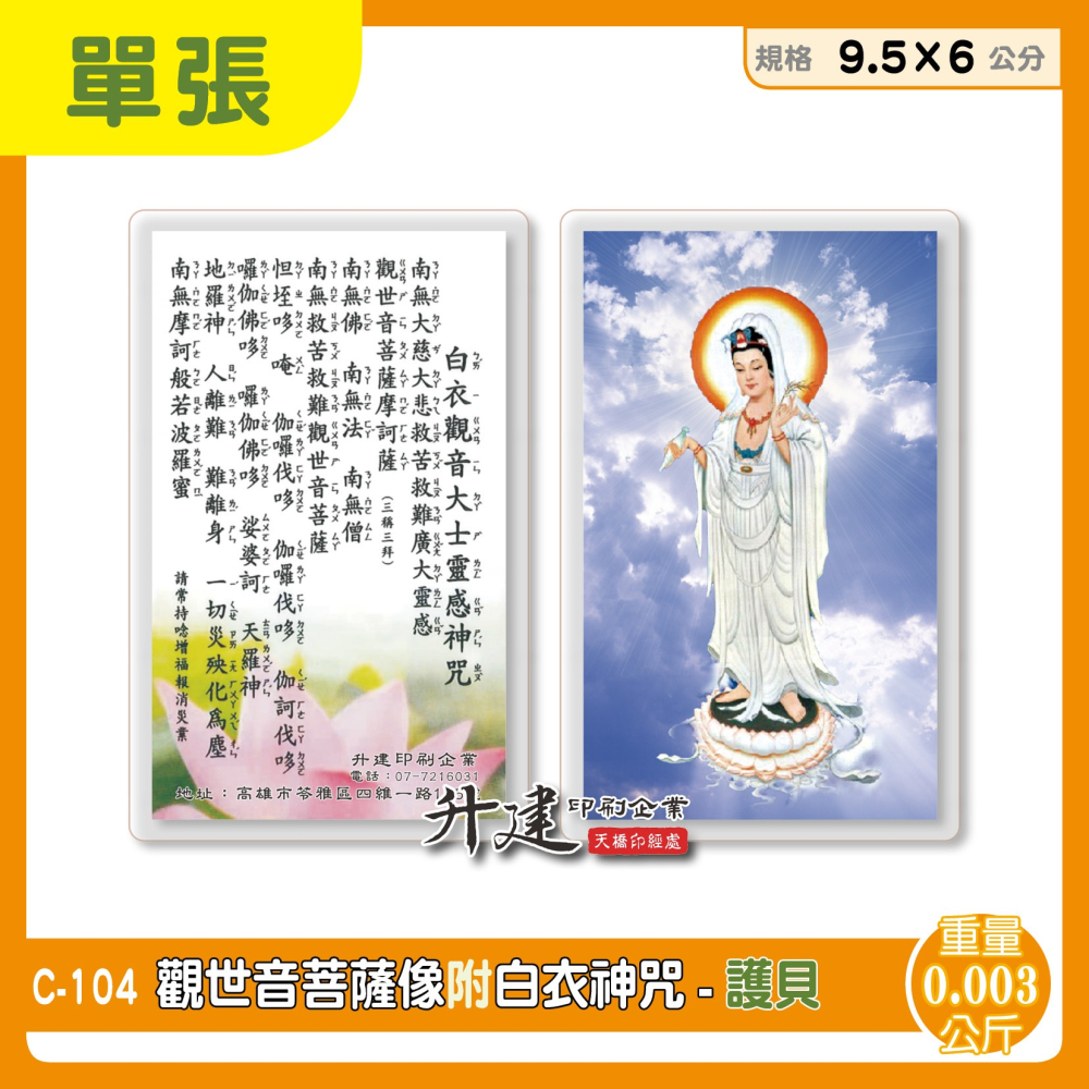 【天橋印經處】C-104觀世音菩薩像附白衣神咒/護貝佛卡