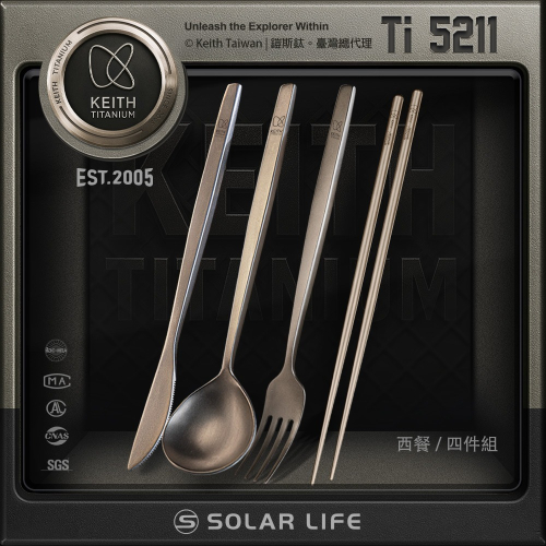 內容:Ti5205鈦餐匙 x 1、Ti5207鈦餐叉 x 1、Ti5208鈦餐刀 x 1、Ti5622鈦筷 x 1