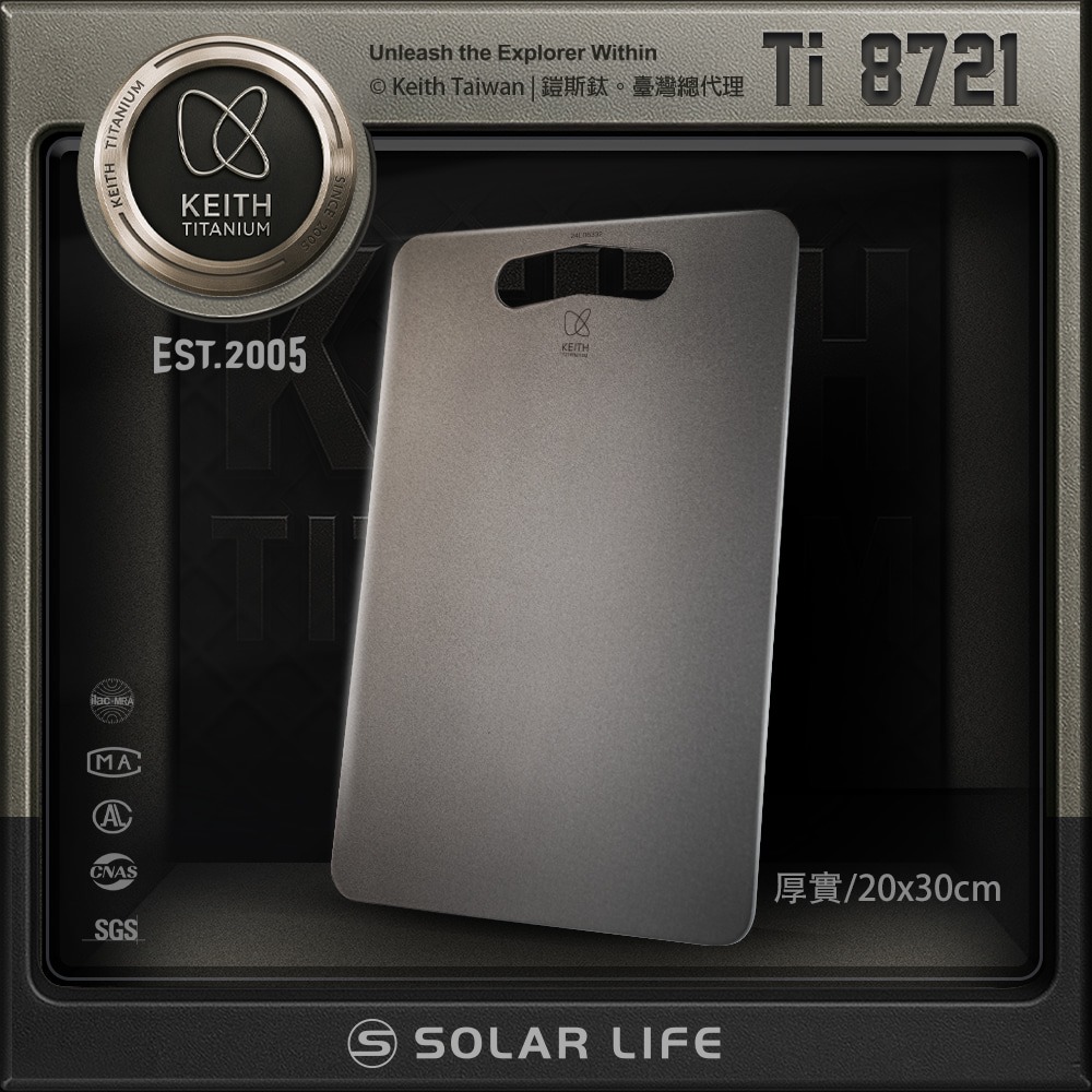 後來看到這款鈦砧板,純鈦本色、極簡設計,除了在家使用,尺寸接近A4影印紙,薄薄一片,帶去露營省下不少空間,還可當成餐盤使用。