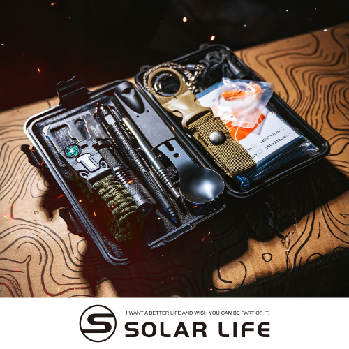 內容:打火石 x 1、吹火棒 x 1、刀+餐具勺 x 1、強光3檔手電筒 x 1、線鋸 x 1、水瓶掛扣 x 1、多功能手鍊 x 1、鎢鋼破窗防衛筆 x 1、工具卡 x 1、急救毯 x 1、釣魚用具 x 1、四號盒子 x 1