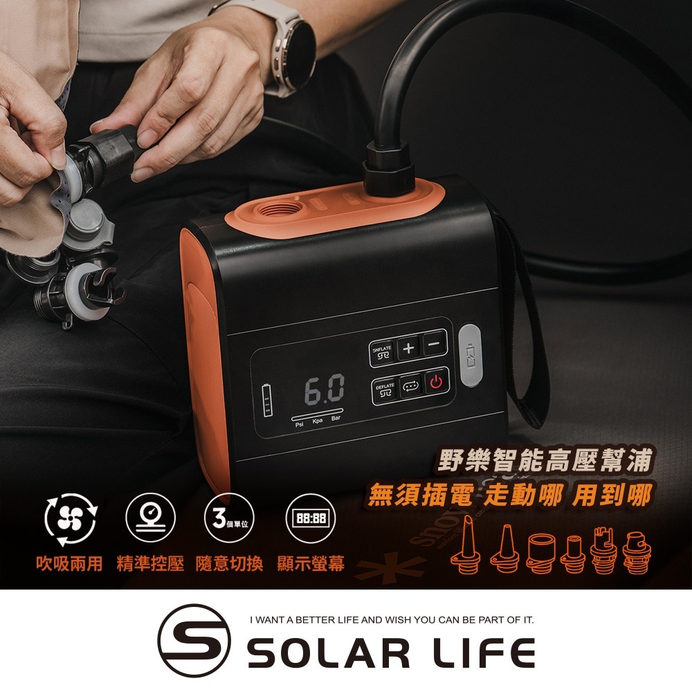 此款幫浦具備雙向充放氣功能,最高可達 22PSI,搭配六種氣嘴,輕鬆應對帳篷、充氣墊、SUP、泳圈等多元戶外需求,可預設氣壓,充飽自動停止,內建高精度氣壓感知器,有效解放雙手,