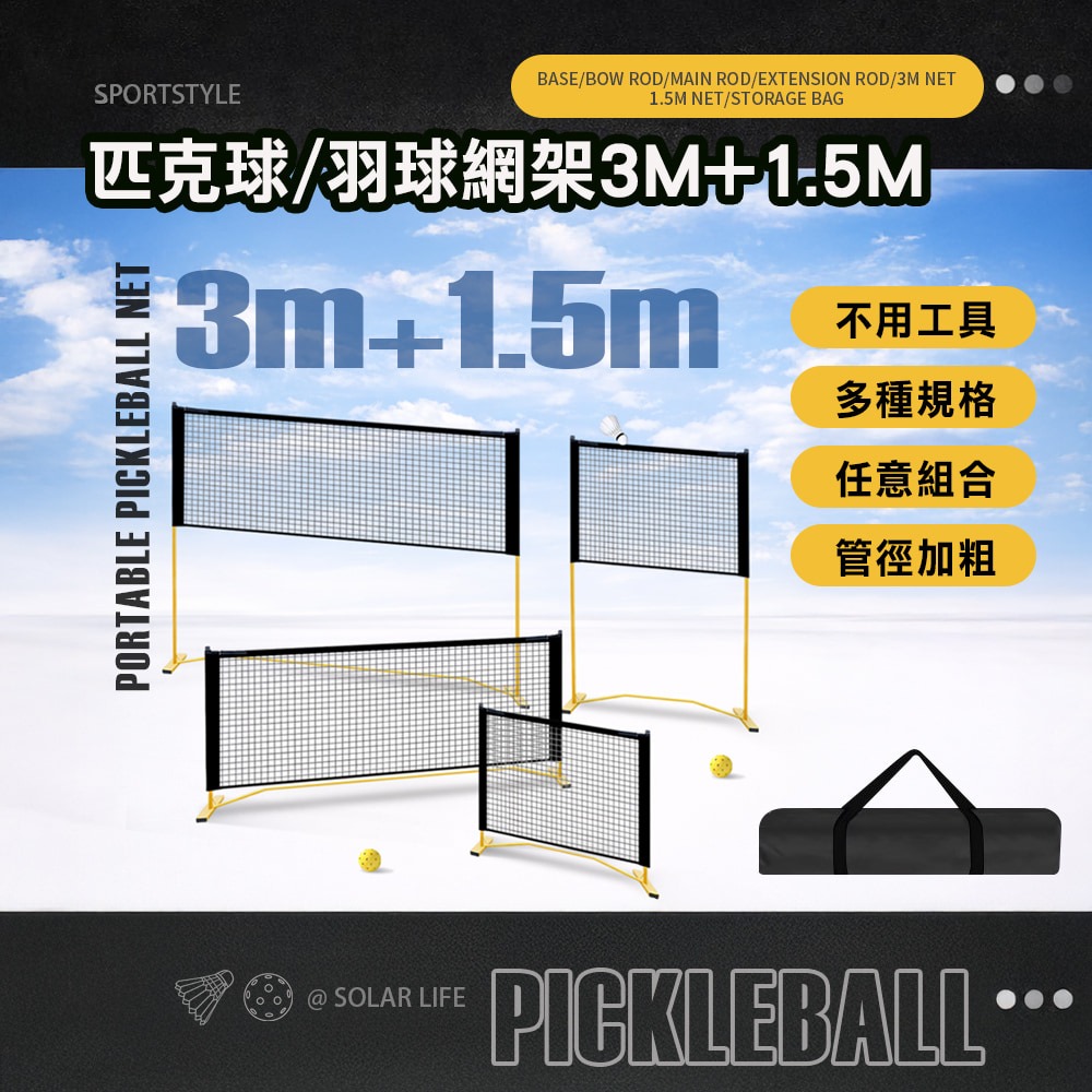 網架3m+1.5m四用內容:底座 x 2、弓桿 x 2、主桿 x 2、延伸桿 x 4、1.5M網子 x 1、3M網子 x 1、收納袋 x 1