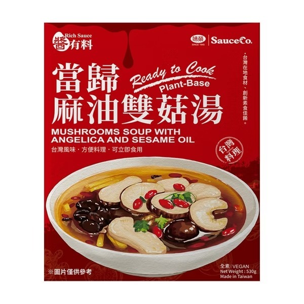成分:水、杏鲍菇、黑蠔菇、味噌(非基改)、味醂(水、糯米、米麴、葡萄糖、酵母抽出物、鹽)、麻油、薑、葵花油、香菇濃縮精(香菇抽出物、鹽)、昆布抽出物、鹽、香菇、酵母抽出物、當歸粉、枸杞、當歸片。
