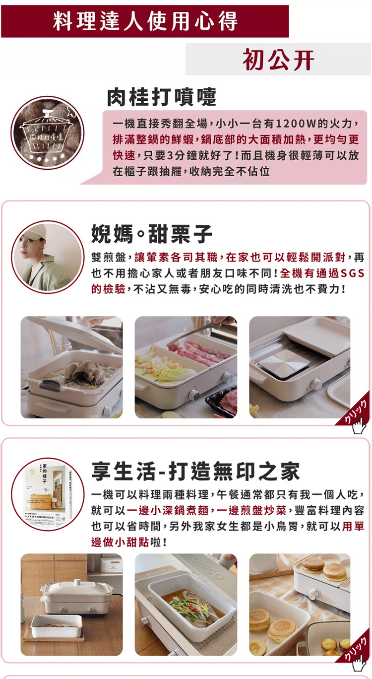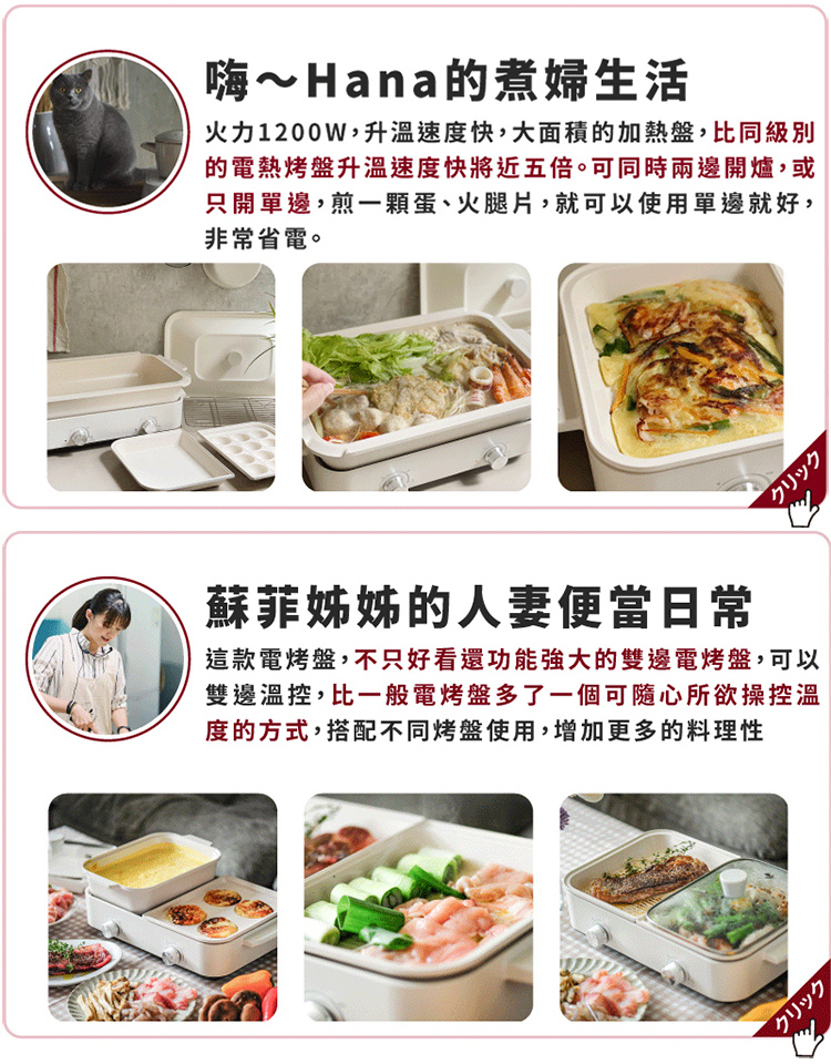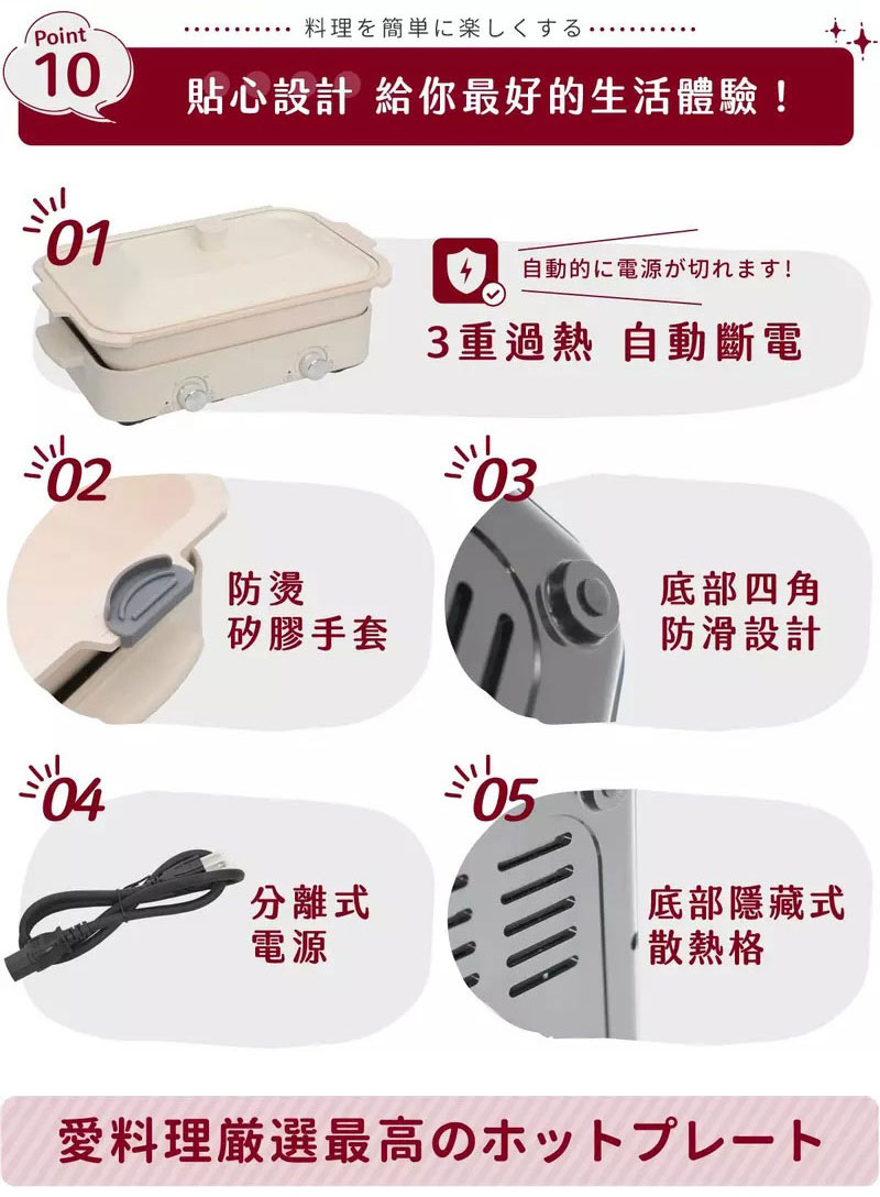✨配件:主機x1、大深鍋鍋蓋x1、大深鍋x1、小煎盤x2、防燙矽膠套x2、電源線x1、說明書x1、保固書x1