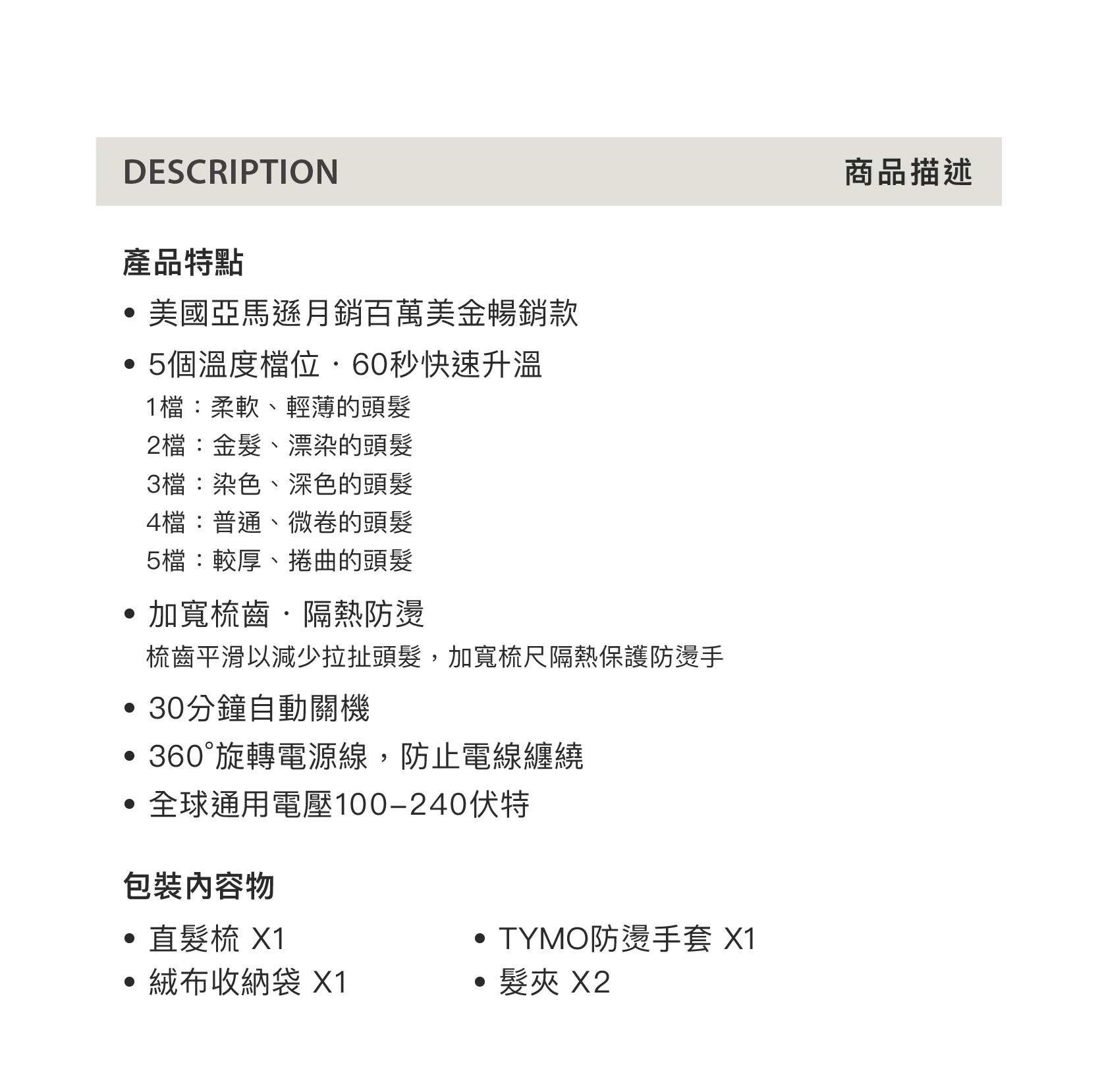 商品配件:直髮梳*1 / 不打結順髮梳*1/ 絨布收納袋*1 / 防燙手套*1 / 無痕髮夾*2 / 說明書*1