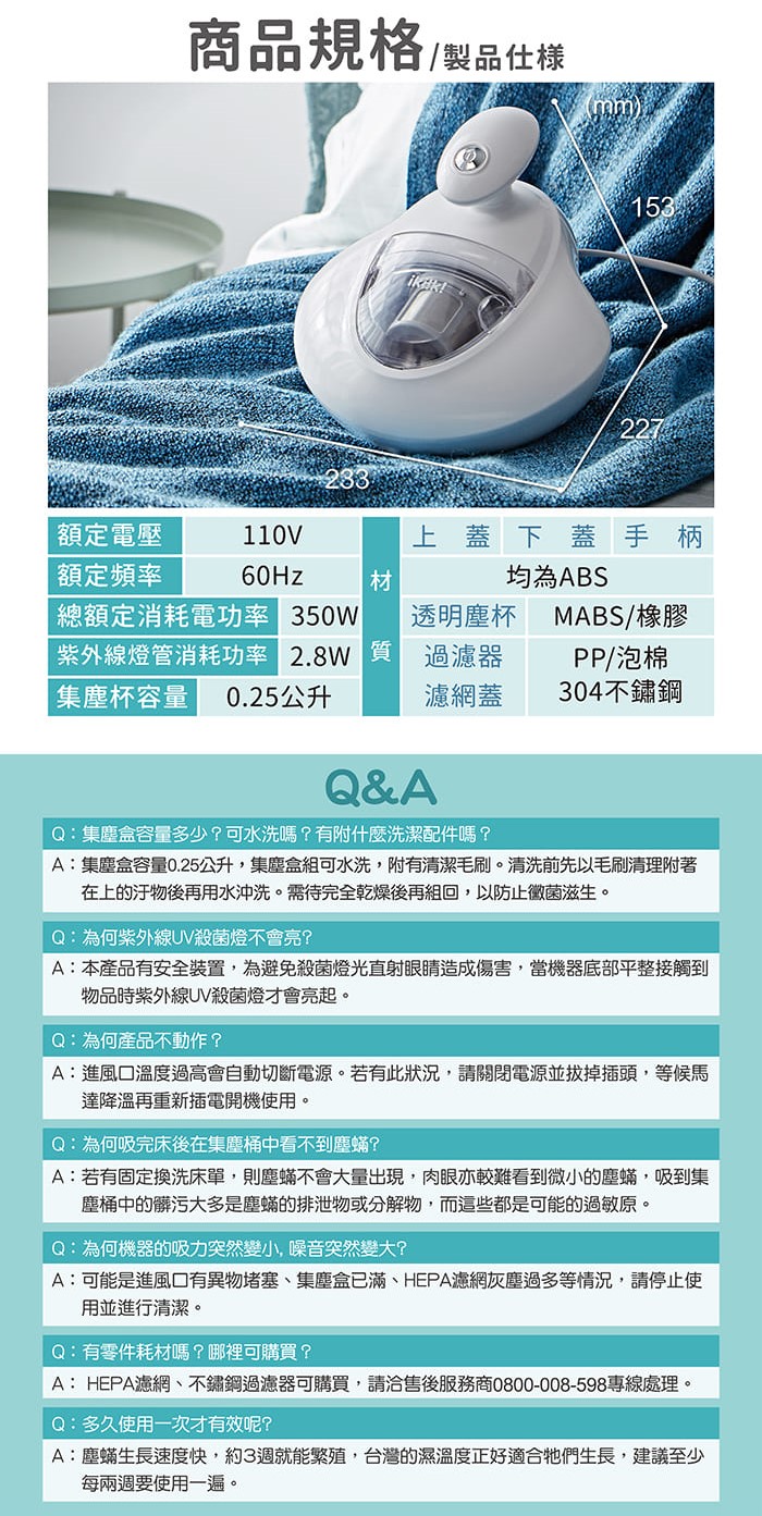 ✨紫外線燈管消耗功率:2.8W\✨集塵盒容量:約0.25公升