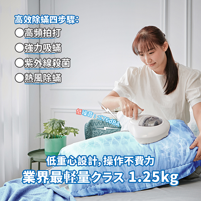 ✨每分鐘6000次高頻強震拍打,可將黏附在棉絨裡的塵蟎震動鬆脫。