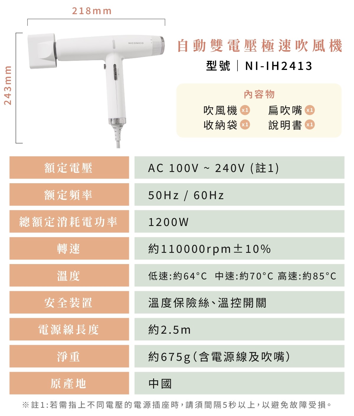 ✨商品名稱:NICONICO 世界通用高速吹風機 NI-IH2413