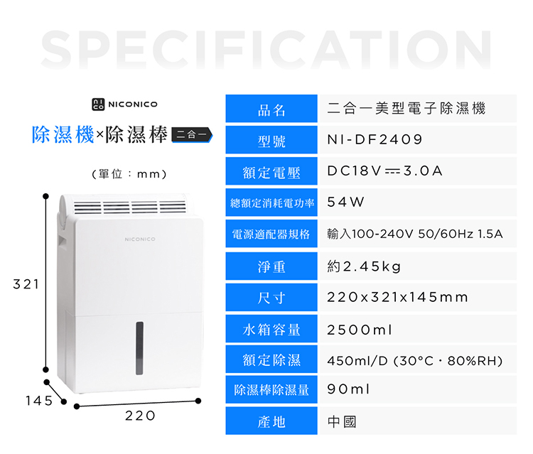 ✨額定除濕450ML/D (30°Cㆍ80%RH)