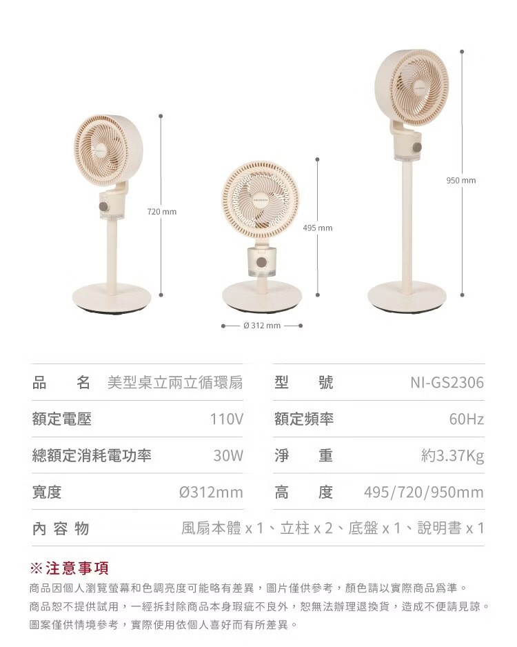 ✨桌扇/立扇兩用模式,兩段式高度調整