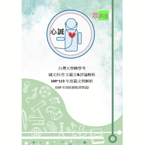 轉學考試中,台灣大學國文考試科目的作文題目(100%)常使用一篇文章或者一段引文來引導考生思考撰寫方向,並將自訂題目交給考生(一個題目分數就佔10%),但小心別犯了一個陷阱,受到出題老師引導文的影響;擔心寫超出題目範圍或者只環繞著題目題材而略顯不足,此產品可藉由範文的原始批改分數,以及文章評論者的建議與修正來提升作文分數,有效讓學生寫出一篇【正確用語" "正確格式" "呼應主題】的出題教授眼中的高分作文,有效提升你在轉學考試的錄取分數。
