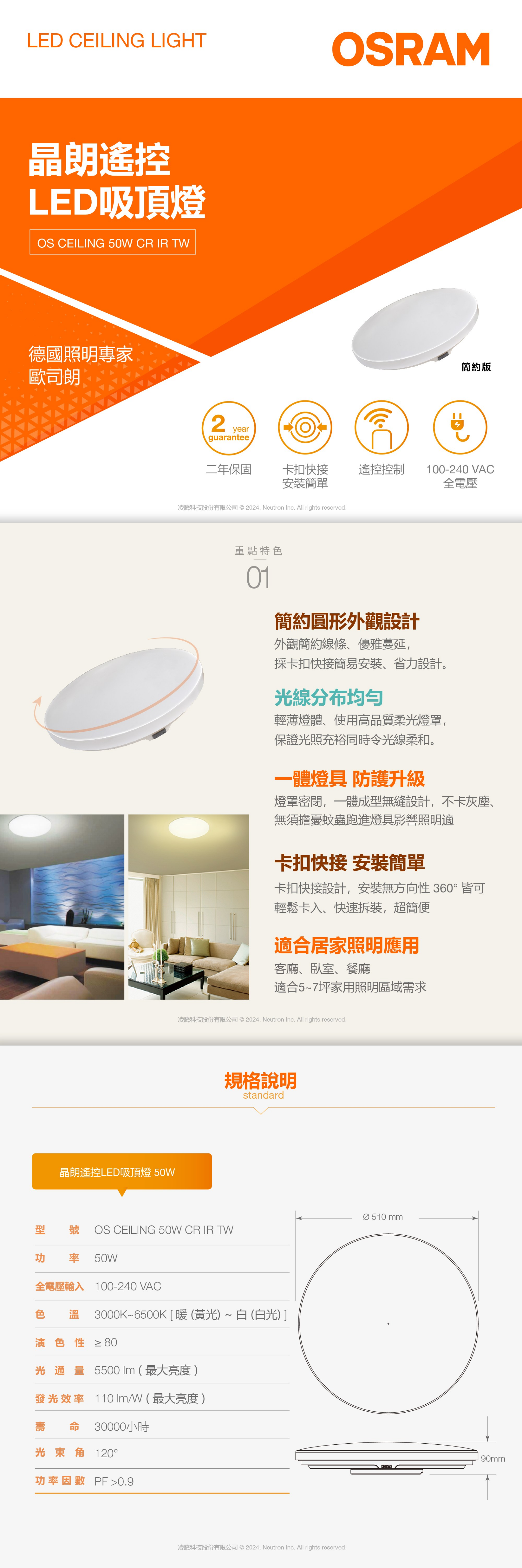 OSRAM 歐司朗 晶朗 LED 50W 調光調色吸頂燈 簡約