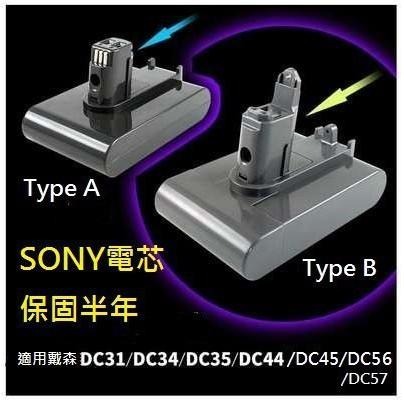 Dyson吸塵器副廠電池, 適用型號:Dyson 戴森 DC31、DC44、 DC45、 DC34、 DC35 (TYPE-A一按鈕即可取下) 適用型號:Dyson 戴森 DC31、DC44、 DC45、 DC34、 DC35、DC56、DC57 (TYPE-B-拆螺絲方可取下) 相容原廠電池型號:917083-01 電蕊種類:鋰離子(Li-ion) 電池容量:5500MAH (原廠僅1300MAH) 輸出電壓:22.2V